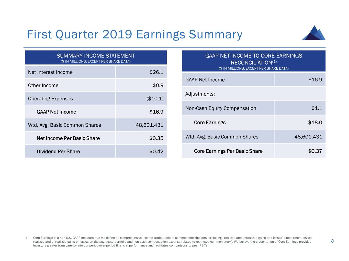 Interest Rate Sensitivity • A 100 basis point increase in U.S. LIBOR would increase our annual net interest income per share by approximately $0.20 NET INTEREST INCOME PER SHARE SENSIVITY TO PORTFOLIO FLOATING VS FIXED CHANGES IN US LIBOR(1) $0.20 $0.15 $0.10 $0.05 Floating, 98.4% -$0.05 -$0.10 -$0.13 -$0.12 Fixed, -1.00% -0.75% -0.50% -0.25% 0.25% 0.50% 0.75% 1.00% 1.6% Change in LIBOR (BPS) (1) Represents estimated change in net interest income for theoretical +25 basis points parallel shifts in LIBOR. All projected changes in annualized net interest income are measured as the change from our 7 projected annualized net interest income based off of current performance returns on portfolio as it existed on March 31, 2019.