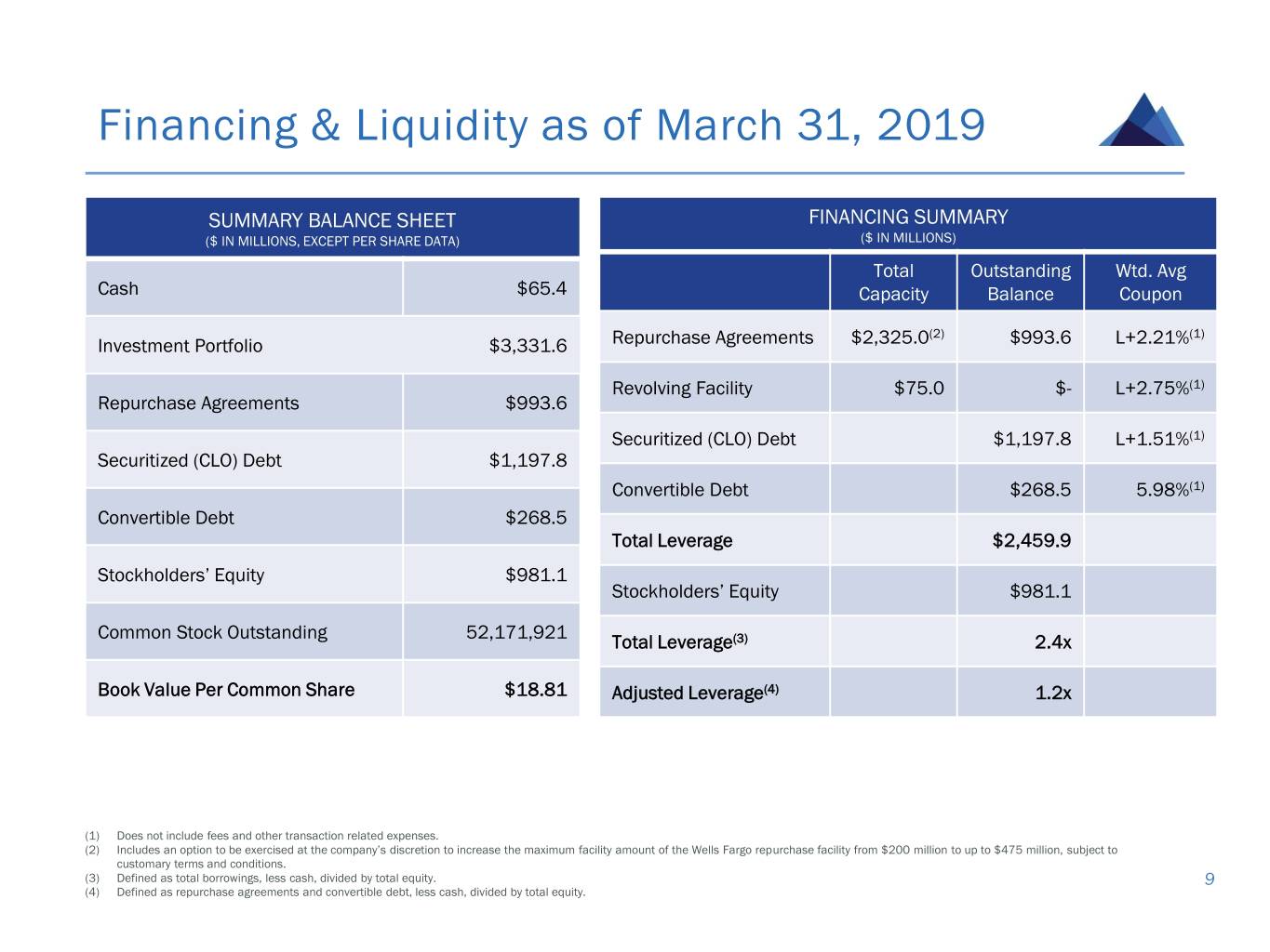 First Quarter 2019 Earnings Summary SUMMARY INCOME STATEMENT GAAP NET INCOME TO CORE EARNINGS ($ IN MILLIONS, EXCEPT PER SHARE DATA) RECONCILIATION(1) ($ IN MILLIONS, EXCEPT PER SHARE DATA) Net Interest Income $26.1 GAAP Net Income $16.9 Other Income $0.9 Adjustments: Operating Expenses ($10.1) Non-Cash Equity Compensation $1.1 GAAP Net Income $16.9 Wtd. Avg. Basic Common Shares 48,601,431 Core Earnings $18.0 Net Income Per Basic Share $0.35 Wtd. Avg. Basic Common Shares 48,601,431 Dividend Per Share $0.42 Core Earnings Per Basic Share $0.37 (1) Core Earnings is a non-U.S. GAAP measure that we define as comprehensive income attributable to common stockholders, excluding “realized and unrealized gains and losses” (impairment losses, realized and unrealized gains or losses on the aggregate portfolio and non-cash compensation expense related to restricted common stock). We believe the presentation of Core Earnings provides 8 investors greater transparency into our period-over-period financial performance and facilitates comparisons to peer REITs.