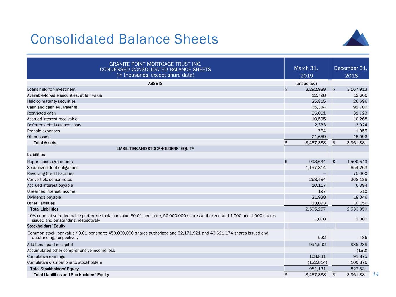 Consolidated Balance Sheets GRANITE POINT MORTGAGE TRUST INC. CONDENSED CONSOLIDATED BALANCE SHEETS March 31, December 31, (in thousands, except share data) 2019 2018 ASSETS (unaudited) Loans held-for-investment $ 3,292,989 $ 3,167,913 Available-for-sale securities, at fair value 12,798 12,606 Held-to-maturity securities 25,815 26,696 Cash and cash equivalents 65,384 91,700 Restricted cash 55,051 31,723 Accrued interest receivable 10,595 10,268 Deferred debt issuance costs 2,333 3,924 Prepaid expenses 764 1,055 Other assets 21,659 15,996 Total Assets $ 3,487,388 $ 3,361,881 LIABILITIES AND STOCKHOLDERS’ EQUITY Liabilities Repurchase agreements $ 993,634 $ 1,500,543 Securitized debt obligations 1,197,814 654,263 Revolving Credit Facilities — 75,000 Convertible senior notes 268,484 268,138 Accrued interest payable 10,117 6,394 Unearned interest income 197 510 Dividends payable 21,938 18,346 Other liabilities 13,073 10,156 Total Liabilities 2,505,257 2,533,350 10% cumulative redeemable preferred stock, par value $0.01 per share; 50,000,000 shares authorized and 1,000 and 1,000 shares issued and outstanding, respectively 1,000 1,000 Stockholders’ Equity Common stock, par value $0.01 per share; 450,000,000 shares authorized and 52,171,921 and 43,621,174 shares issued and outstanding, respectively 522 436 Additional paid-in capital 994,592 836,288 Accumulated other comprehensive income loss — (192) Cumulative earnings 108,831 91,875 Cumulative distributions to stockholders (122,814) (100,876) Total Stockholders’ Equity 981,131 827,531 Total Liabilities and Stockholders’ Equity $ 3,487,388 $ 3,361,881 14