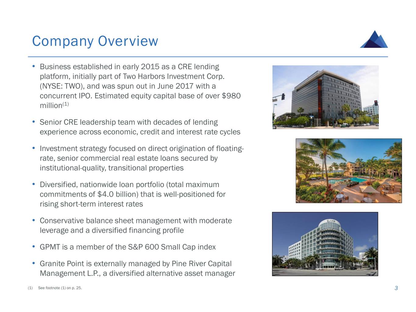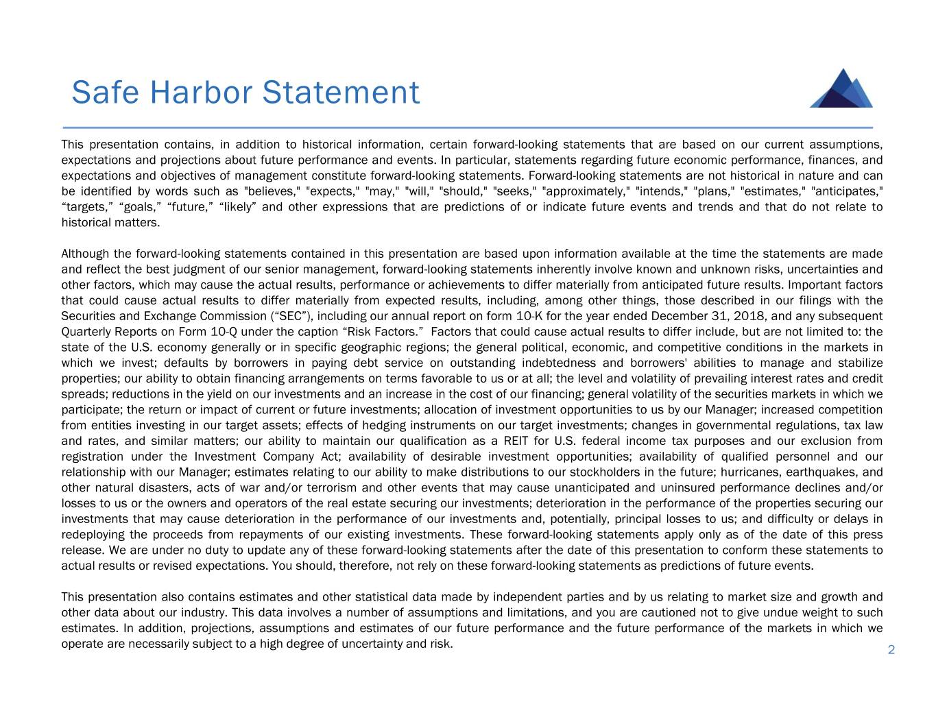 Safe Harbor Statement This presentation contains, in addition to historical information, certain forward-looking statements that are based on our current assumptions, expectations and projections about future performance and events. In particular, statements regarding future economic performance, finances, and expectations and objectives of management constitute forward-looking statements. Forward-looking statements are not historical in nature and can be identified by words such as "believes," "expects," "may," "will," "should," "seeks," "approximately," "intends," "plans," "estimates," "anticipates," “targets,” “goals,” “future,” “likely” and other expressions that are predictions of or indicate future events and trends and that do not relate to historical matters. Although the forward-looking statements contained in this presentation are based upon information available at the time the statements are made and reflect the best judgment of our senior management, forward-looking statements inherently involve known and unknown risks, uncertainties and other factors, which may cause the actual results, performance or achievements to differ materially from anticipated future results. Important factors that could cause actual results to differ materially from expected results, including, among other things, those described in our filings with the Securities and Exchange Commission (“SEC”), including our annual report on form 10-K for the year ended December 31, 2018, and any subsequent Quarterly Reports on Form 10-Q under the caption “Risk Factors.” Factors that could cause actual results to differ include, but are not limited to: the state of the U.S. economy generally or in specific geographic regions; the general political, economic, and competitive conditions in the markets in which we invest; defaults by borrowers in paying debt service on outstanding indebtedness and borrowers' abilities to manage and stabilize properties; our ability to obtain financing arrangements on terms favorable to us or at all; the level and volatility of prevailing interest rates and credit spreads; reductions in the yield on our investments and an increase in the cost of our financing; general volatility of the securities markets in which we participate; the return or impact of current or future investments; allocation of investment opportunities to us by our Manager; increased competition from entities investing in our target assets; effects of hedging instruments on our target investments; changes in governmental regulations, tax law and rates, and similar matters; our ability to maintain our qualification as a REIT for U.S. federal income tax purposes and our exclusion from registration under the Investment Company Act; availability of desirable investment opportunities; availability of qualified personnel and our relationship with our Manager; estimates relating to our ability to make distributions to our stockholders in the future; hurricanes, earthquakes, and other natural disasters, acts of war and/or terrorism and other events that may cause unanticipated and uninsured performance declines and/or losses to us or the owners and operators of the real estate securing our investments; deterioration in the performance of the properties securing our investments that may cause deterioration in the performance of our investments and, potentially, principal losses to us; and difficulty or delays in redeploying the proceeds from repayments of our existing investments. These forward-looking statements apply only as of the date of this press release. We are under no duty to update any of these forward-looking statements after the date of this presentation to conform these statements to actual results or revised expectations. You should, therefore, not rely on these forward-looking statements as predictions of future events. This presentation also contains estimates and other statistical data made by independent parties and by us relating to market size and growth and other data about our industry. This data involves a number of assumptions and limitations, and you are cautioned not to give undue weight to such estimates. In addition, projections, assumptions and estimates of our future performance and the future performance of the markets in which we operate are necessarily subject to a high degree of uncertainty and risk. 2