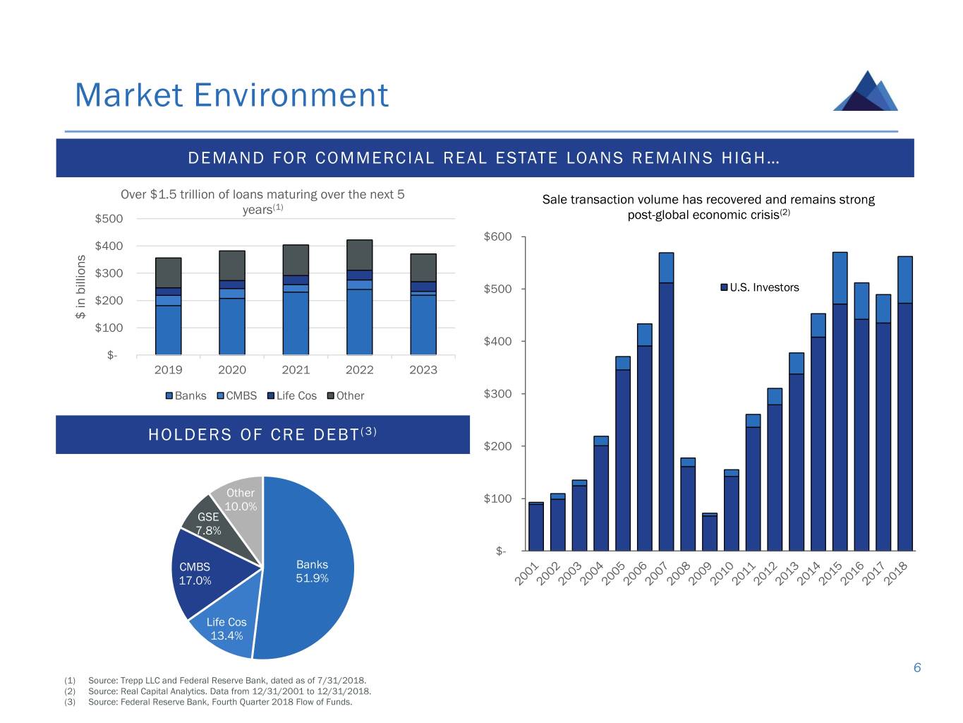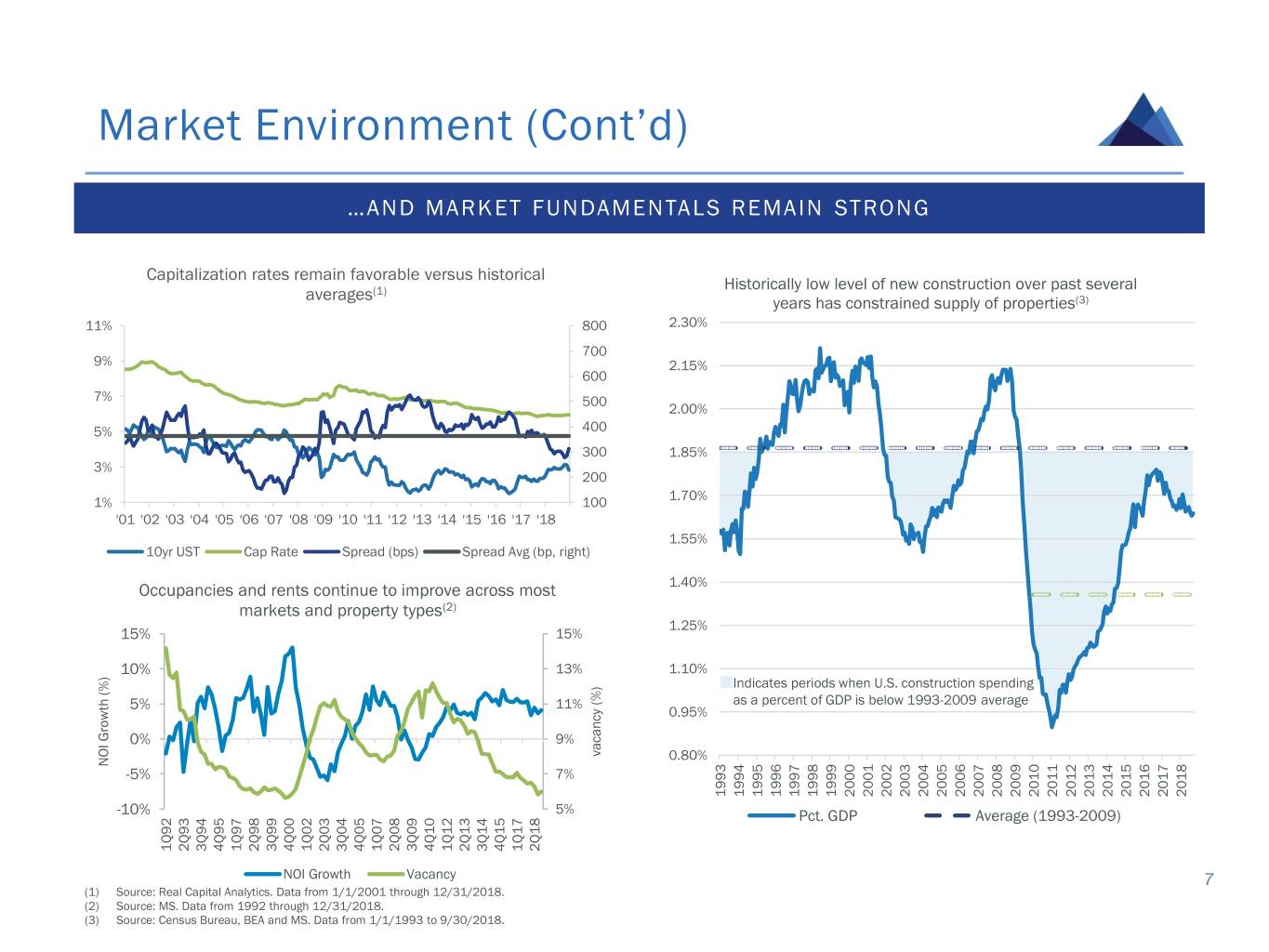 Market Environment DEMAND FOR COMMERCIAL REAL ESTATE LOANS REMAINS HIGH… Over $1.5 trillion of loans maturing over the next 5 Sale transaction volume has recovered and remains strong (1) years (2) $500 post-global economic crisis $600 $400 $300 $500 U.S. Investors $200 $ in billions $100 $400 $- 2019 2020 2021 2022 2023 Banks CMBS Life Cos Other $300 HOLDERS OF CRE DEBT (3) $200 Other $100 10.0% GSE 7.8% $- CMBS Banks 17.0% 51.9% Life Cos 13.4% Total CRE Debt: ~$3 trillion 6 (1) Source: Trepp LLC and Federal Reserve Bank, dated as of 7/31/2018. (2) Source: Real Capital Analytics. Data from 12/31/2001 to 12/31/2018. (3) Source: Federal Reserve Bank, Fourth Quarter 2018 Flow of Funds.