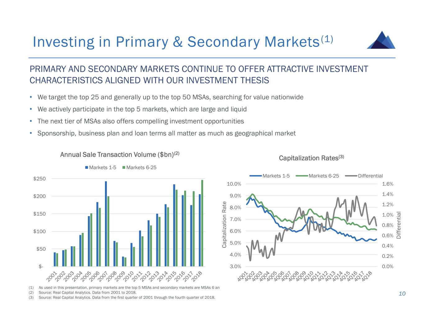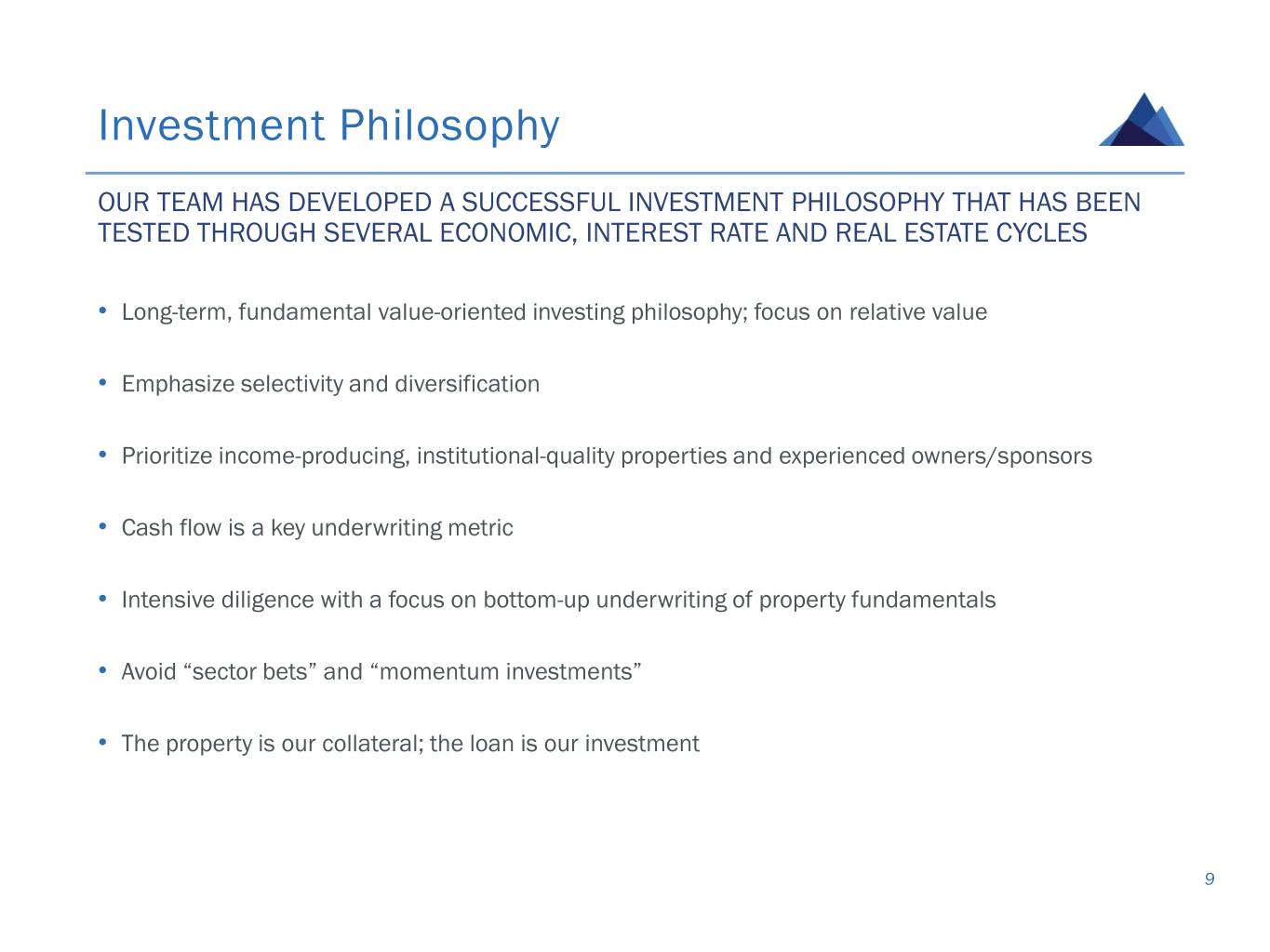 Investment Philosophy OUR TEAM HAS DEVELOPED A SUCCESSFUL INVESTMENT PHILOSOPHY THAT HAS BEEN TESTED THROUGH SEVERAL ECONOMIC, INTEREST RATE AND REAL ESTATE CYCLES • Long-term, fundamental value-oriented investing philosophy; focus on relative value • Emphasize selectivity and diversification • Prioritize income-producing, institutional-quality properties and experienced owners/sponsors • Cash flow is a key underwriting metric • Intensive diligence with a focus on bottom-up underwriting of property fundamentals • Avoid “sector bets” and “momentum investments” • The property is our collateral; the loan is our investment 9