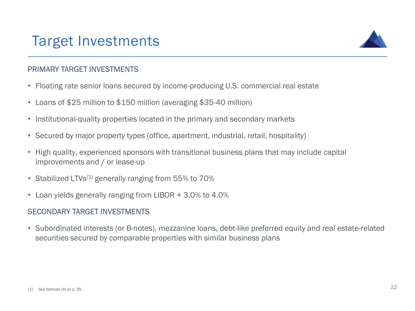 Target Investments PRIMARY TARGET INVESTMENTS • Floating rate senior loans secured by income-producing U.S. commercial real estate • Loans of $25 million to $150 million (averaging $35-40 million) • Institutional-quality properties located in the primary and secondary markets • Secured by major property types (office, apartment, industrial, retail, hospitality) • High quality, experienced sponsors with transitional business plans that may include capital improvements and / or lease-up • Stabilized LTVs(1) generally ranging from 55% to 70% • Loan yields generally ranging from LIBOR + 3.0% to 4.0% SECONDARY TARGET INVESTMENTS • Subordinated interests (or B-notes), mezzanine loans, debt-like preferred equity and real estate-related securities secured by comparable properties with similar business plans (1) See footnote (6) on p. 25. 12
