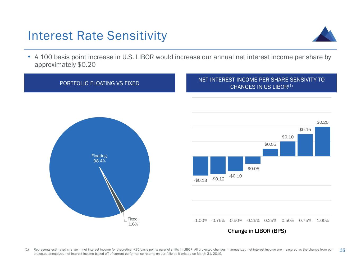 Interest Rate Sensitivity • A 100 basis point increase in U.S. LIBOR would increase our annual net interest income per share by approximately $0.20 NET INTEREST INCOME PER SHARE SENSIVITY TO PORTFOLIO FLOATING VS FIXED CHANGES IN US LIBOR(1) $0.20 $0.15 $0.10 $0.05 Floating, 98.4% -$0.05 -$0.10 -$0.13 -$0.12 Fixed, -1.00% -0.75% -0.50% -0.25% 0.25% 0.50% 0.75% 1.00% 1.6% Change in LIBOR (BPS) (1) Represents estimated change in net interest income for theoretical +25 basis points parallel shifts in LIBOR. All projected changes in annualized net interest income are measured as the change from our 18 projected annualized net interest income based off of current performance returns on portfolio as it existed on March 31, 2019.