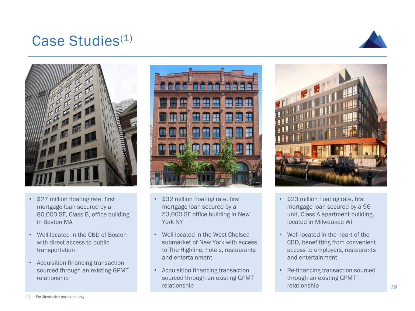 Case Studies(1) • $27 million floating rate, first • $32 million floating rate, first • $23 million floating rate, first mortgage loan secured by a mortgage loan secured by a mortgage loan secured by a 96 80,000 SF, Class B, office building 53,000 SF office building in New unit, Class A apartment building, in Boston MA York NY located in Milwaukee WI • Well-located in the CBD of Boston • Well-located in the West Chelsea • Well-located in the heart of the with direct access to public submarket of New York with access CBD, benefitting from convenient transportation to The Highline, hotels, restaurants access to employers, restaurants and entertainment and entertainment • Acquisition financing transaction sourced through an existing GPMT • Acquisition financing transaction • Re-financing transaction sourced relationship sourced through an existing GPMT through an existing GPMT relationship relationship 19 (1) For illustrative purposes only.