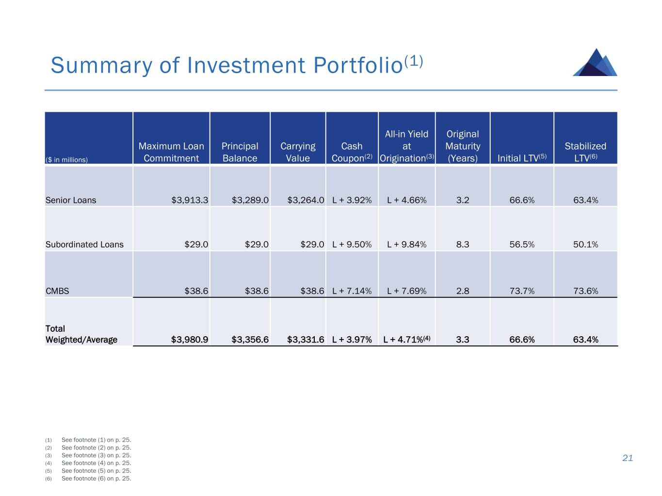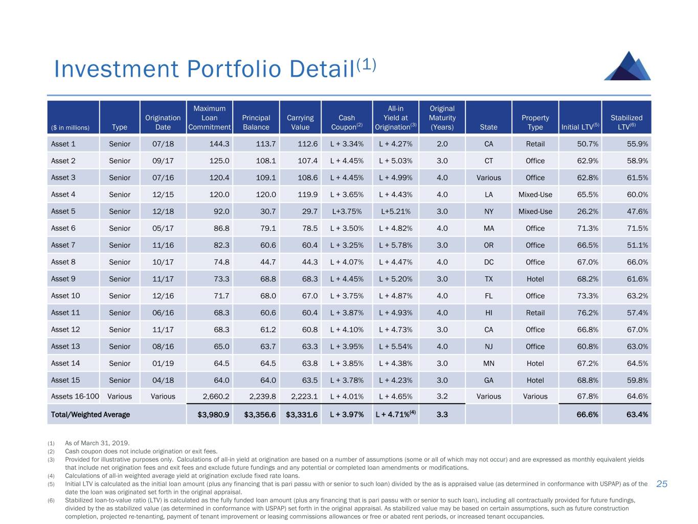 Investment Portfolio Detail(1) Maximum All-in Original Origination Loan Principal Carrying Cash Yield at Maturity Property Stabilized ($ in millions) Type Date Commitment Balance Value Coupon(2) Origination(3) (Years) State Type Initial LTV(5) LTV(6) Asset 1 Senior 07/18 144.3 113.7 112.6 L + 3.34% L + 4.27% 2.0 CA Retail 50.7% 55.9% Asset 2 Senior 09/17 125.0 108.1 107.4 L + 4.45% L + 5.03% 3.0 CT Office 62.9% 58.9% Asset 3 Senior 07/16 120.4 109.1 108.6 L + 4.45% L + 4.99% 4.0 Various Office 62.8% 61.5% Asset 4 Senior 12/15 120.0 120.0 119.9 L + 3.65% L + 4.43% 4.0 LA Mixed-Use 65.5% 60.0% Asset 5 Senior 12/18 92.0 30.7 29.7 L+3.75% L+5.21% 3.0 NY Mixed-Use 26.2% 47.6% Asset 6 Senior 05/17 86.8 79.1 78.5 L + 3.50% L + 4.82% 4.0 MA Office 71.3% 71.5% Asset 7 Senior 11/16 82.3 60.6 60.4 L + 3.25% L + 5.78% 3.0 OR Office 66.5% 51.1% Asset 8 Senior 10/17 74.8 44.7 44.3 L + 4.07% L + 4.47% 4.0 DC Office 67.0% 66.0% Asset 9 Senior 11/17 73.3 68.8 68.3 L + 4.45% L + 5.20% 3.0 TX Hotel 68.2% 61.6% Asset 10 Senior 12/16 71.7 68.0 67.0 L + 3.75% L + 4.87% 4.0 FL Office 73.3% 63.2% Asset 11 Senior 06/16 68.3 60.6 60.4 L + 3.87% L + 4.93% 4.0 HI Retail 76.2% 57.4% Asset 12 Senior 11/17 68.3 61.2 60.8 L + 4.10% L + 4.73% 3.0 CA Office 66.8% 67.0% Asset 13 Senior 08/16 65.0 63.7 63.3 L + 3.95% L + 5.54% 4.0 NJ Office 60.8% 63.0% Asset 14 Senior 01/19 64.5 64.5 63.8 L + 3.85% L + 4.38% 3.0 MN Hotel 67.2% 64.5% Asset 15 Senior 04/18 64.0 64.0 63.5 L + 3.78% L + 4.23% 3.0 GA Hotel 68.8% 59.8% Assets 16-100 Various Various 2,660.2 2,239.8 2,223.1 L + 4.01% L + 4.65% 3.2 Various Various 67.8% 64.6% Total/Weighted Average $3,980.9 $3,356.6 $3,331.6 L + 3.97% L + 4.71%(4) 3.3 66.6% 63.4% (1) As of March 31, 2019. (2) Cash coupon does not include origination or exit fees. (3) Provided for illustrative purposes only. Calculations of all-in yield at origination are based on a number of assumptions (some or all of which may not occur) and are expressed as monthly equivalent yields that include net origination fees and exit fees and exclude future fundings and any potential or completed loan amendments or modifications. (4) Calculations of all-in weighted average yield at origination exclude fixed rate loans. (5) Initial LTV is calculated as the initial loan amount (plus any financing that is pari passu with or senior to such loan) divided by the as is appraised value (as determined in conformance with USPAP) as of the 25 date the loan was originated set forth in the original appraisal. (6) Stabilized loan-to-value ratio (LTV) is calculated as the fully funded loan amount (plus any financing that is pari passu with or senior to such loan), including all contractually provided for future fundings, divided by the as stabilized value (as determined in conformance with USPAP) set forth in the original appraisal. As stabilized value may be based on certain assumptions, such as future construction completion, projected re-tenanting, payment of tenant improvement or leasing commissions allowances or free or abated rent periods, or increased tenant occupancies.