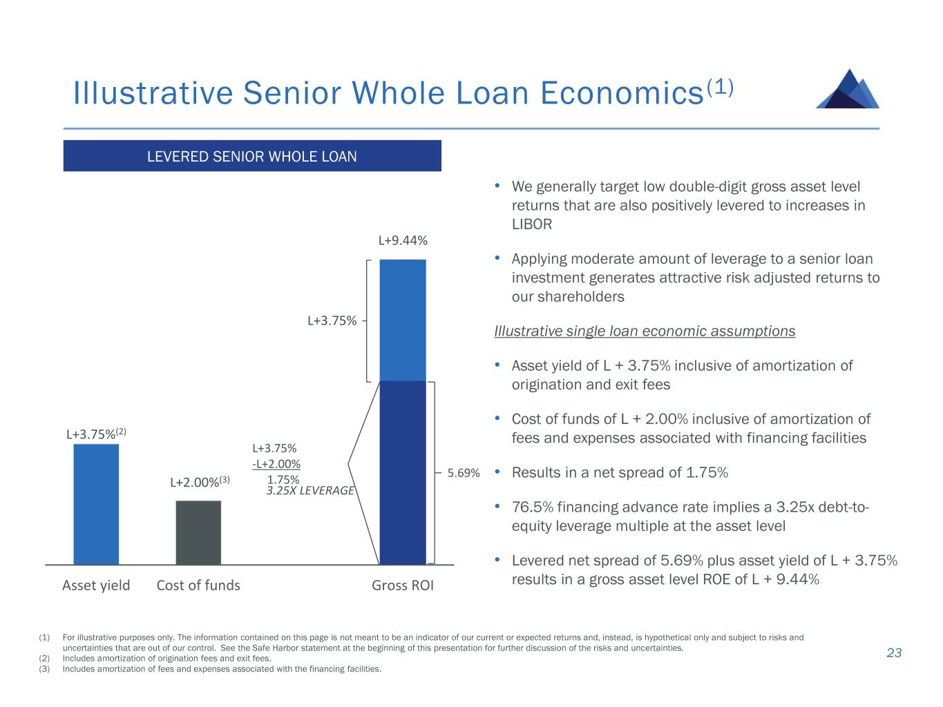 Illustrative Senior Whole Loan Economics(1) LEVERED SENIOR WHOLE LOAN • We generally target low double-digit gross asset level returns that are also positively levered to increases in LIBOR L+9.44% • Applying moderate amount of leverage to a senior loan investment generates attractive risk adjusted returns to our shareholders L+3.75% Illustrative single loan economic assumptions • Asset yield of L + 3.75% inclusive of amortization of origination and exit fees • Cost of funds of L + 2.00% inclusive of amortization of L+3.75%(2) fees and expenses associated with financing facilities L+3.75% -L+2.00% 5.69% • Results in a net spread of 1.75% L+2.00%(3) 1.75% 3.25X LEVERAGE • 76.5% financing advance rate implies a 3.25x debt-to- equity leverage multiple at the asset level • Levered net spread of 5.69% plus asset yield of L + 3.75% Asset yield Cost of funds Gross ROI results in a gross asset level ROE of L + 9.44% (1) For illustrative purposes only. The information contained on this page is not meant to be an indicator of our current or expected returns and, instead, is hypothetical only and subject to risks and uncertainties that are out of our control. See the Safe Harbor statement at the beginning of this presentation for further discussion of the risks and uncertainties. (2) Includes amortization of origination fees and exit fees. 23 (3) Includes amortization of fees and expenses associated with the financing facilities.