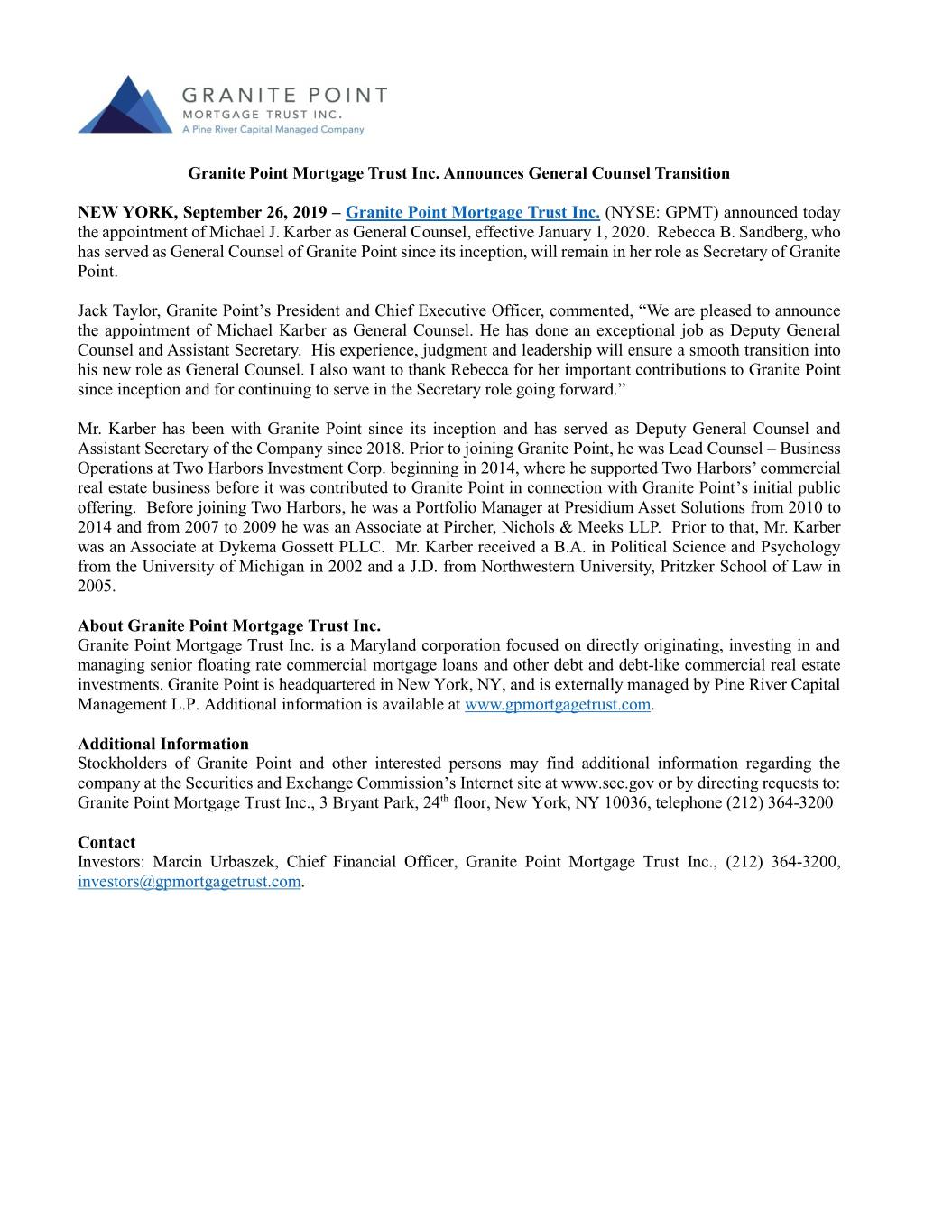 Granite Point Mortgage Trust Inc. Announces General Counsel Transition NEW YORK, September 26, 2019 – Granite Point Mortgage Trust Inc. (NYSE: GPMT) announced today the appointment of Michael J. Karber as General Counsel, effective January 1, 2020. Rebecca B. Sandberg, who has served as General Counsel of Granite Point since its inception, will remain in her role as Secretary of Granite Point. Jack Taylor, Granite Point’s President and Chief Executive Officer, commented, “We are pleased to announce the appointment of Michael Karber as General Counsel. He has done an exceptional job as Deputy General Counsel and Assistant Secretary. His experience, judgment and leadership will ensure a smooth transition into his new role as General Counsel. I also want to thank Rebecca for her important contributions to Granite Point since inception and for continuing to serve in the Secretary role going forward.” Mr. Karber has been with Granite Point since its inception and has served as Deputy General Counsel and Assistant Secretary of the Company since 2018. Prior to joining Granite Point, he was Lead Counsel – Business Operations at Two Harbors Investment Corp. beginning in 2014, where he supported Two Harbors’ commercial real estate business before it was contributed to Granite Point in connection with Granite Point’s initial public offering. Before joining Two Harbors, he was a Portfolio Manager at Presidium Asset Solutions from 2010 to 2014 and from 2007 to 2009 he was an Associate at Pircher, Nichols & Meeks LLP. Prior to that, Mr. Karber was an Associate at Dykema Gossett PLLC. Mr. Karber received a B.A. in Political Science and Psychology from the University of Michigan in 2002 and a J.D. from Northwestern University, Pritzker School of Law in 2005. About Granite Point Mortgage Trust Inc. Granite Point Mortgage Trust Inc. is a Maryland corporation focused on directly originating, investing in and managing senior floating rate commercial mortgage loans and other debt and debt-like commercial real estate investments. Granite Point is headquartered in New York, NY, and is externally managed by Pine River Capital Management L.P. Additional information is available at www.gpmortgagetrust.com. Additional Information Stockholders of Granite Point and other interested persons may find additional information regarding the company at the Securities and Exchange Commission’s Internet site at www.sec.gov or by directing requests to: Granite Point Mortgage Trust Inc., 3 Bryant Park, 24th floor, New York, NY 10036, telephone (212) 364-3200 Contact Investors: Marcin Urbaszek, Chief Financial Officer, Granite Point Mortgage Trust Inc., (212) 364-3200, investors@gpmortgagetrust.com.