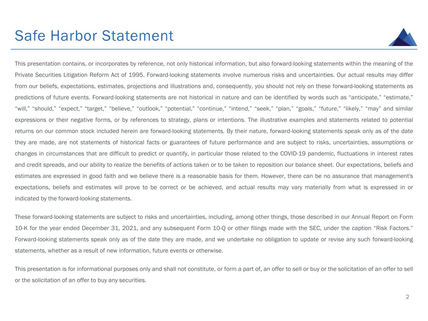 Safe Harbor Statement This presentation contains, or incorporates by reference, not only historical information, but also forward-looking statements within the meaning of the Private Securities Litigation Reform Act of 1995. Forward-looking statements involve numerous risks and uncertainties. Our actual results may differ from our beliefs, expectations, estimates, projections and illustrations and, consequently, you should not rely on these forward-looking statements as predictions of future events. Forward-looking statements are not historical in nature and can be identified by words such as “anticipate,” “estimate,” “will,” “should,” “expect,” “target,” “believe,” “outlook,” “potential,” “continue,” “intend,” “seek,” “plan,” “goals,” “future,” “likely,” “may” and similar expressions or their negative forms, or by references to strategy, plans or intentions. The illustrative examples and statements related to potential returns on our common stock included herein are forward-looking statements. By their nature, forward-looking statements speak only as of the date they are made, are not statements of historical facts or guarantees of future performance and are subject to risks, uncertainties, assumptions or changes in circumstances that are difficult to predict or quantify, in particular those related to the COVID-19 pandemic, fluctuations in interest rates and credit spreads, and our ability to realize the benefits of actions taken or to be taken to reposition our balance sheet. Our expectations, beliefs and estimates are expressed in good faith and we believe there is a reasonable basis for them. However, there can be no assurance that management's expectations, beliefs and estimates will prove to be correct or be achieved, and actual results may vary materially from what is expressed in or indicated by the forward-looking statements. These forward-looking statements are subject to risks and uncertainties, including, among other things, those described in our Annual Report on Form 10-K for the year ended December 31, 2021, and any subsequent Form 10-Q or other filings made with the SEC, under the caption “Risk Factors.” Forward-looking statements speak only as of the date they are made, and we undertake no obligation to update or revise any such forward-looking statements, whether as a result of new information, future events or otherwise. This presentation is for informational purposes only and shall not constitute, or form a part of, an offer to sell or buy or the solicitation of an offer to sell or the solicitation of an offer to buy any securities. 2