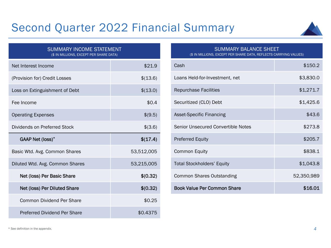 FINANCIAL SUMMARY ▪ GAAP net (loss)* of $(17.4) million, or $(0.32) per basic share, inclusive of $(13.0) million, or $(0.25) per basic share, loss on early extinguishment of debt and $(13.6) million, or $(0.26) per basic share, provision for credit losses. ▪ Distributable Earnings** of $11.7 million, or $0.22 per basic share. ▪ Book value per common share of $16.01, inclusive of $(0.96) per common share CECL reserve. ▪ Common stock dividend per share of $0.25; Series A preferred dividend per share of $0.4375. PORTFOLIO ACTIVITY ▪ Closed on $202.1 million of loan commitments and funded $212.2 million(1) in total UPB, including prior commitments. ▪ Realized $120.1 million in total UPB in loan repayments, paydowns, and principal amortization. PORTFOLIO OVERVIEW ▪ $4.2 billion in commitments comprised of over 99% senior loans with a weighted average stabilized LTV of 63.1%† and a weighted average yield at origination of LIBOR/SOFR + 4.07%†; over 98% floating rate with a weighted average LIBOR/SOFR floor of 1.05%. ▪ Weighted average risk rating of 2.5 at June 30, 2022, unchanged from March 31, 2022. ▪ CECL reserve of approx. $50.1 million, or 1.18% of total portfolio commitments. CAPITALIZATION & LIQUIDITY ▪ Repurchased over 1.5 million common shares at an average price of $10.18 per share for a total of $15.7 million, resulting in book value accretion of approximately $0.17 per share. ▪ Successfully refinanced two legacy funding vehicles, retiring inefficient and higher-cost liabilities, while raising over $180 million of liquidity. ▪ Repaid the remaining $100 million of borrowings under the higher-cost senior secured term loan facilities. ▪ Increased borrowing capacity to $600 million on the Morgan Stanley financing facility; extended its maturity to June 2023. ▪ Extended maturities of the Citi Bank, JPMorgan and Wells Fargo financing facilities to May 2025, June 2024, and June 2023, respectively. ▪ Ended Q2 with over $150 million in unrestricted cash and total net debt-to-equity leverage of 2.7x. Second Quarter 2022 Highlights 3 * Represents Net Income Attributable to Common Stockholders; see definition in the appendix. ** See definition and reconciliation to GAAP net income in the appendix. † See definition in the appendix.