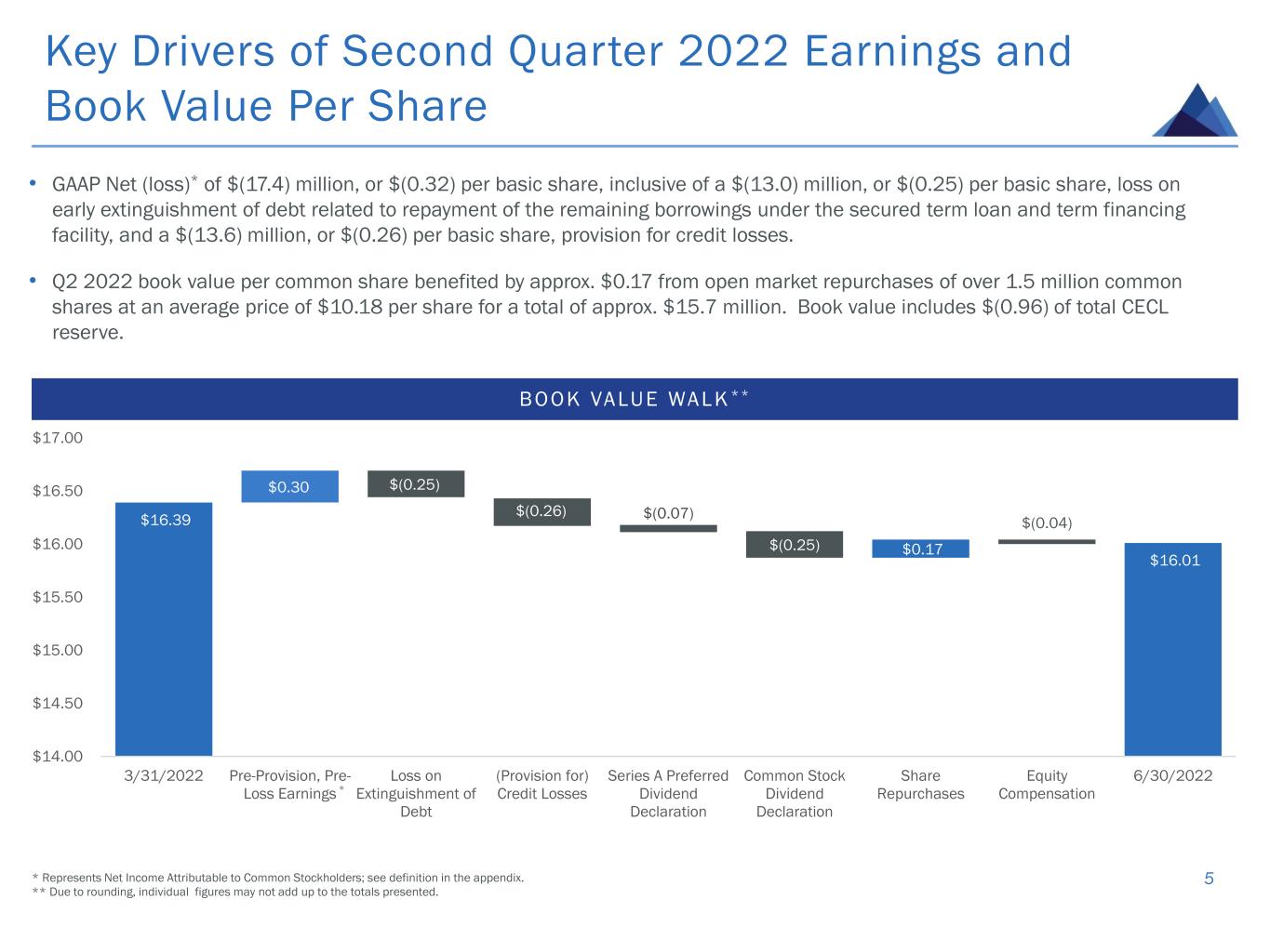 SUMMARY INCOME STATEMENT ($ IN MILLIONS, EXCEPT PER SHARE DATA) Net Interest Income $21.9 (Provision for) Credit Losses $(13.6) Loss on Extinguishment of Debt $(13.0) Fee Income $0.4 Operating Expenses $(9.5) Dividends on Preferred Stock $(3.6) GAAP Net (loss)* $(17.4) Basic Wtd. Avg. Common Shares 53,512,005 Diluted Wtd. Avg. Common Shares 53,215,005 Net (loss) Per Basic Share $(0.32) Net (loss) Per Diluted Share $(0.32) Common Dividend Per Share $0.25 Preferred Dividend Per Share $0.4375 Second Quarter 2022 Financial Summary 4* See definition in the appendix. SUMMARY BALANCE SHEET ($ IN MILLIONS, EXCEPT PER SHARE DATA, REFLECTS CARRYING VALUES) Cash $150.2 Loans Held-for-Investment, net $3,830.0 Repurchase Facilities $1,271.7 Securitized (CLO) Debt $1,425.6 Asset-Specific Financing $43.6 Senior Unsecured Convertible Notes $273.8 Preferred Equity $205.7 Common Equity $838.1 Total Stockholders’ Equity $1,043.8 Common Shares Outstanding 52,350,989 Book Value Per Common Share $16.01