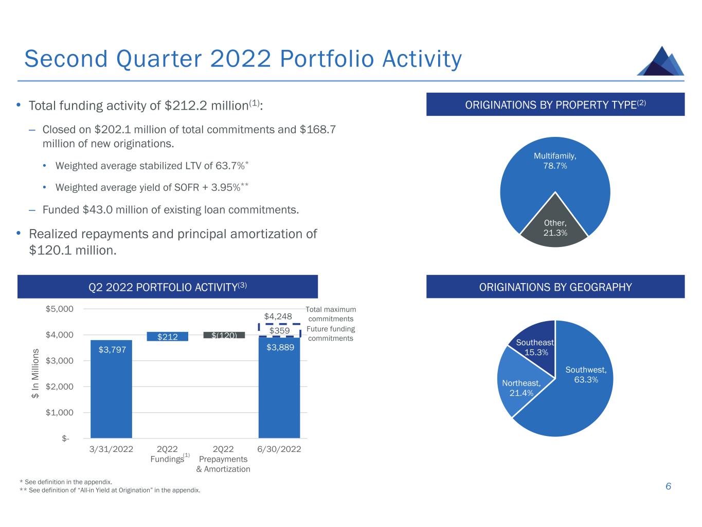 $16.39 $16.01 $0.30 $(0.25) $(0.26) $(0.07) $(0.25) $0.17 $(0.04) $14.00 $14.50 $15.00 $15.50 $16.00 $16.50 $17.00 3/31/2022 Pre-Provision, Pre- Loss Earnings Loss on Extinguishment of Debt (Provision for) Credit Losses Series A Preferred Dividend Declaration Common Stock Dividend Declaration Share Repurchases Equity Compensation 6/30/2022 Key Drivers of Second Quarter 2022 Earnings and Book Value Per Share • GAAP Net (loss)* of $(17.4) million, or $(0.32) per basic share, inclusive of a $(13.0) million, or $(0.25) per basic share, loss on early extinguishment of debt related to repayment of the remaining borrowings under the secured term loan and term financing facility, and a $(13.6) million, or $(0.26) per basic share, provision for credit losses. • Q2 2022 book value per common share benefited by approx. $0.17 from open market repurchases of over 1.5 million common shares at an average price of $10.18 per share for a total of approx. $15.7 million. Book value includes $(0.96) of total CECL reserve. 5 BOOK VALUE WALK * * * * Represents Net Income Attributable to Common Stockholders; see definition in the appendix. ** Due to rounding, individual figures may not add up to the totals presented.