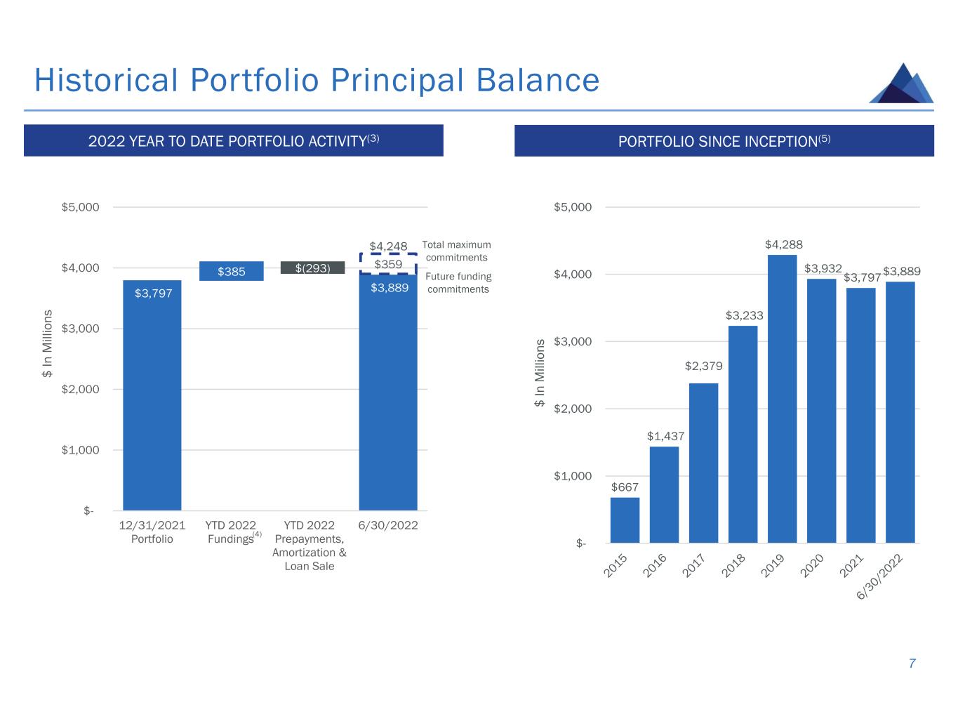 $3,797 $3,889 $- $1,000 $2,000 $3,000 $4,000 $5,000 3/31/2022 2Q22 Fundings 2Q22 Prepayments & Amortization 6/30/2022 $ I n M il li o n s Q2 2022 PORTFOLIO ACTIVITY(3) Second Quarter 2022 Portfolio Activity 6 * See definition in the appendix. ** See definition of “All-in Yield at Origination” in the appendix. ORIGINATIONS BY PROPERTY TYPE(2) $212 $(120) $4,248 $359 Total maximum commitments Future funding commitments ORIGINATIONS BY GEOGRAPHY • Total funding activity of $212.2 million(1): – Closed on $202.1 million of total commitments and $168.7 million of new originations. • Weighted average stabilized LTV of 63.7%* • Weighted average yield of SOFR + 3.95%** – Funded $43.0 million of existing loan commitments. • Realized repayments and principal amortization of $120.1 million. Multifamily, 78.7% Other, 21.3% Southwest, 63.3%Northeast, 21.4% Southeast, 15.3% (1)
