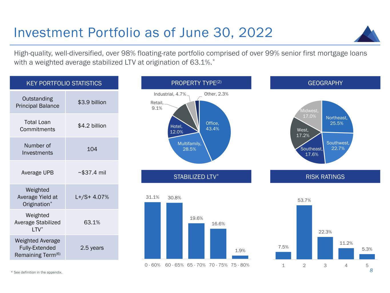 $3,797 $3,889 $- $1,000 $2,000 $3,000 $4,000 $5,000 12/31/2021 Portfolio YTD 2022 Fundings YTD 2022 Prepayments, Amortization & Loan Sale 6/30/2022 $ I n M il li o n s (4) Historical Portfolio Principal Balance 7 2022 YEAR TO DATE PORTFOLIO ACTIVITY(3) PORTFOLIO SINCE INCEPTION(5) $667 $1,437 $2,379 $3,233 $4,288 $3,932 $3,797 $3,889 $- $1,000 $2,000 $3,000 $4,000 $5,000 $ I n M il li o n s $385 $(293) $4,248 $359 Total maximum commitments Future funding commitments