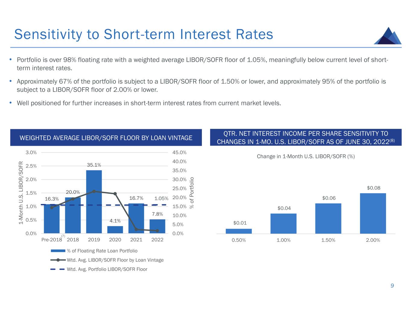 16.3% 20.0% 35.1% 4.1% 16.7% 7.8% 0.0% 5.0% 10.0% 15.0% 20.0% 25.0% 30.0% 35.0% 40.0% 45.0% 0.0% 0.5% 1.0% 1.5% 2.0% 2.5% 3.0% Pre-2018 2018 2019 2020 2021 2022 % o f P o rt fo li o 1 -M o n th U .S . L IB O R / S O F R % of Floating Rate Loan Portfolio Wtd. Avg. LIBOR/SOFR Floor by Loan Vintage Wtd. Avg. Portfolio LIBOR/SOFR Floor 1.05% 9 Sensitivity to Short-term Interest Rates QTR. NET INTEREST INCOME PER SHARE SENSITIVITY TO CHANGES IN 1-MO. U.S. LIBOR/SOFR AS OF JUNE 30, 2022(8) • Portfolio is over 98% floating rate with a weighted average LIBOR/SOFR floor of 1.05%, meaningfully below current level of short- term interest rates. • Approximately 67% of the portfolio is subject to a LIBOR/SOFR floor of 1.50% or lower, and approximately 95% of the portfolio is subject to a LIBOR/SOFR floor of 2.00% or lower. • Well positioned for further increases in short-term interest rates from current market levels. WEIGHTED AVERAGE LIBOR/SOFR FLOOR BY LOAN VINTAGE (7) $0.01 $0.04 $0.06 $0.08 0.50% 1.00% 1.50% 2.00% Change in 1-Month U.S. LIBOR/SOFR (%)