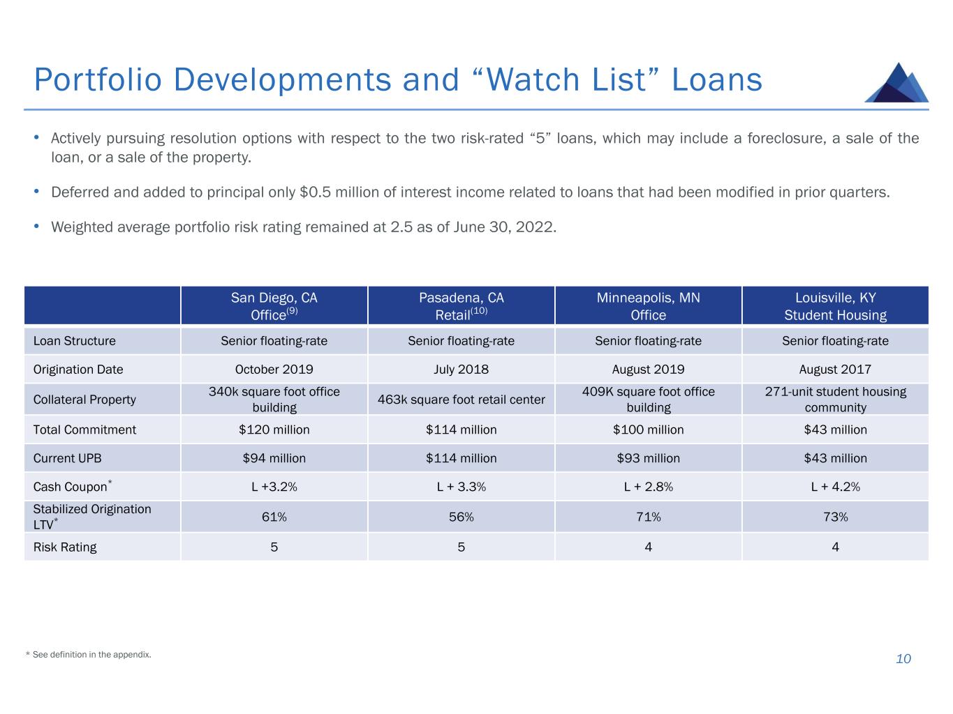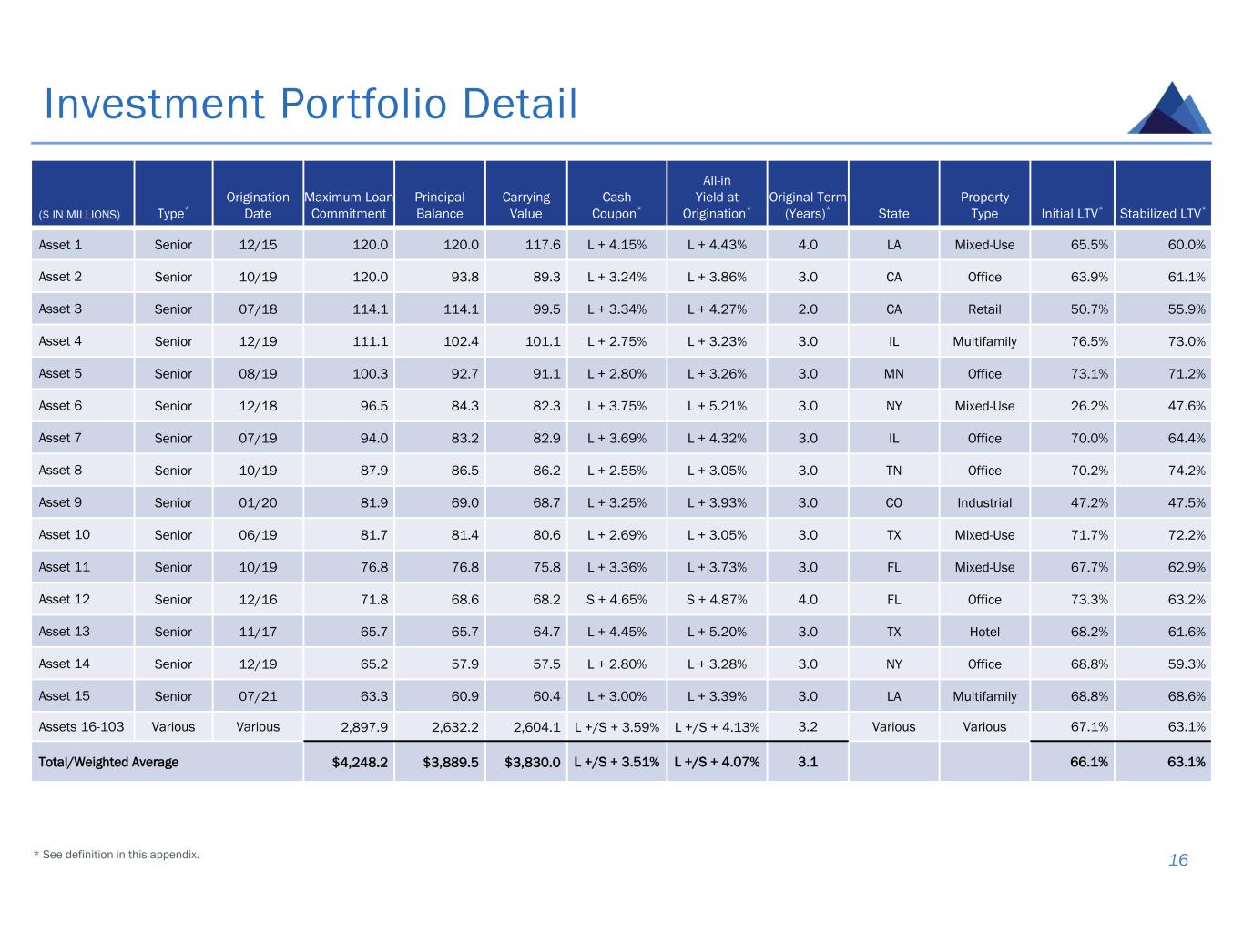 Investment Portfolio Detail 16 ($ IN MILLIONS) Type* Origination Date Maximum Loan Commitment Principal Balance Carrying Value Cash Coupon* All-in Yield at Origination* Original Term (Years)* State Property Type Initial LTV* Stabilized LTV* Asset 1 Senior 12/15 120.0 120.0 117.6 L + 4.15% L + 4.43% 4.0 LA Mixed-Use 65.5% 60.0% Asset 2 Senior 10/19 120.0 93.8 89.3 L + 3.24% L + 3.86% 3.0 CA Office 63.9% 61.1% Asset 3 Senior 07/18 114.1 114.1 99.5 L + 3.34% L + 4.27% 2.0 CA Retail 50.7% 55.9% Asset 4 Senior 12/19 111.1 102.4 101.1 L + 2.75% L + 3.23% 3.0 IL Multifamily 76.5% 73.0% Asset 5 Senior 08/19 100.3 92.7 91.1 L + 2.80% L + 3.26% 3.0 MN Office 73.1% 71.2% Asset 6 Senior 12/18 96.5 84.3 82.3 L + 3.75% L + 5.21% 3.0 NY Mixed-Use 26.2% 47.6% Asset 7 Senior 07/19 94.0 83.2 82.9 L + 3.69% L + 4.32% 3.0 IL Office 70.0% 64.4% Asset 8 Senior 10/19 87.9 86.5 86.2 L + 2.55% L + 3.05% 3.0 TN Office 70.2% 74.2% Asset 9 Senior 01/20 81.9 69.0 68.7 L + 3.25% L + 3.93% 3.0 CO Industrial 47.2% 47.5% Asset 10 Senior 06/19 81.7 81.4 80.6 L + 2.69% L + 3.05% 3.0 TX Mixed-Use 71.7% 72.2% Asset 11 Senior 10/19 76.8 76.8 75.8 L + 3.36% L + 3.73% 3.0 FL Mixed-Use 67.7% 62.9% Asset 12 Senior 12/16 71.8 68.6 68.2 S + 4.65% S + 4.87% 4.0 FL Office 73.3% 63.2% Asset 13 Senior 11/17 65.7 65.7 64.7 L + 4.45% L + 5.20% 3.0 TX Hotel 68.2% 61.6% Asset 14 Senior 12/19 65.2 57.9 57.5 L + 2.80% L + 3.28% 3.0 NY Office 68.8% 59.3% Asset 15 Senior 07/21 63.3 60.9 60.4 L + 3.00% L + 3.39% 3.0 LA Multifamily 68.8% 68.6% Assets 16-103 Various Various 2,897.9 2,632.2 2,604.1 L +/S + 3.59% L +/S + 4.13% 3.2 Various Various 67.1% 63.1% Total/Weighted Average $4,248.2 $3,889.5 $3,830.0 L +/S + 3.51% L +/S + 4.07% 3.1 66.1% 63.1% * See definition in this appendix.
