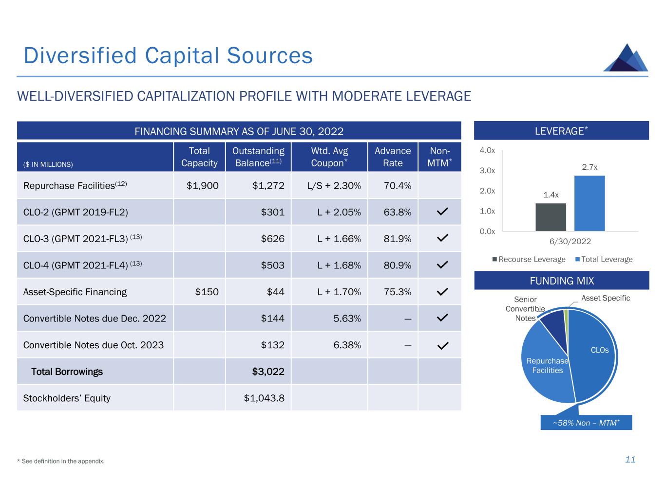 Portfolio Developments and “Watch List” Loans 10 San Diego, CA Office(9) Pasadena, CA Retail(10) Minneapolis, MN Office Louisville, KY Student Housing Loan Structure Senior floating-rate Senior floating-rate Senior floating-rate Senior floating-rate Origination Date October 2019 July 2018 August 2019 August 2017 Collateral Property 340k square foot office building 463k square foot retail center 409K square foot office building 271-unit student housing community Total Commitment $120 million $114 million $100 million $43 million Current UPB $94 million $114 million $93 million $43 million Cash Coupon* L +3.2% L + 3.3% L + 2.8% L + 4.2% Stabilized Origination LTV* 61% 56% 71% 73% Risk Rating 5 5 4 4 * See definition in the appendix. • Actively pursuing resolution options with respect to the two risk-rated “5” loans, which may include a foreclosure, a sale of the loan, or a sale of the property. • Deferred and added to principal only $0.5 million of interest income related to loans that had been modified in prior quarters. • Weighted average portfolio risk rating remained at 2.5 as of June 30, 2022.
