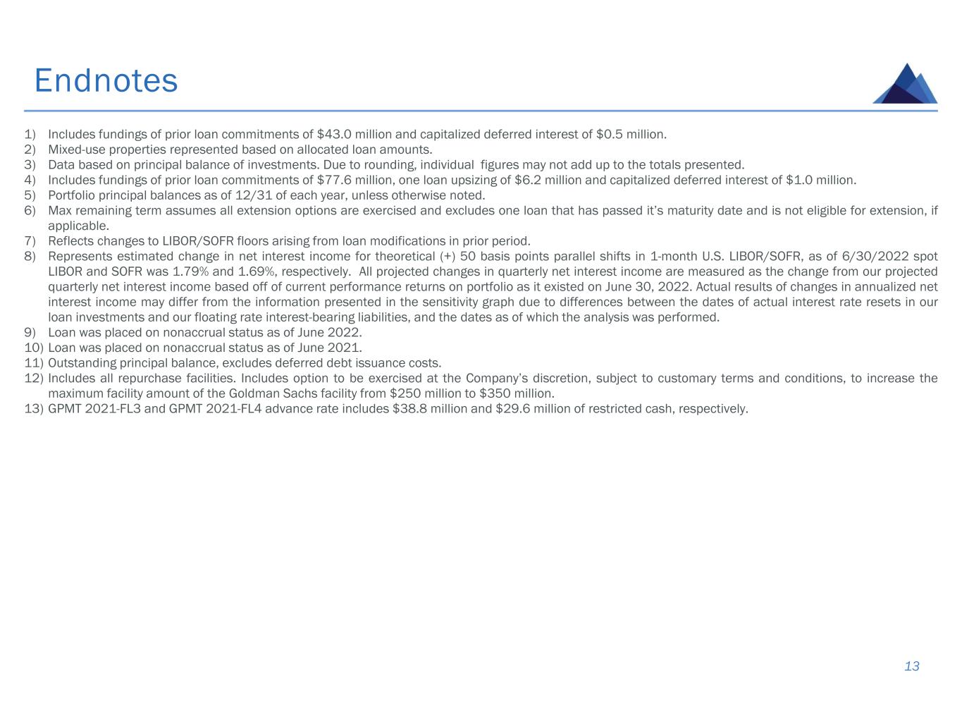 Endnotes 13 1) Includes fundings of prior loan commitments of $43.0 million and capitalized deferred interest of $0.5 million. 2) Mixed-use properties represented based on allocated loan amounts. 3) Data based on principal balance of investments. Due to rounding, individual figures may not add up to the totals presented. 4) Includes fundings of prior loan commitments of $77.6 million, one loan upsizing of $6.2 million and capitalized deferred interest of $1.0 million. 5) Portfolio principal balances as of 12/31 of each year, unless otherwise noted. 6) Max remaining term assumes all extension options are exercised and excludes one loan that has passed it’s maturity date and is not eligible for extension, if applicable. 7) Reflects changes to LIBOR/SOFR floors arising from loan modifications in prior period. 8) Represents estimated change in net interest income for theoretical (+) 50 basis points parallel shifts in 1-month U.S. LIBOR/SOFR, as of 6/30/2022 spot LIBOR and SOFR was 1.79% and 1.69%, respectively. All projected changes in quarterly net interest income are measured as the change from our projected quarterly net interest income based off of current performance returns on portfolio as it existed on June 30, 2022. Actual results of changes in annualized net interest income may differ from the information presented in the sensitivity graph due to differences between the dates of actual interest rate resets in our loan investments and our floating rate interest-bearing liabilities, and the dates as of which the analysis was performed. 9) Loan was placed on nonaccrual status as of June 2022. 10) Loan was placed on nonaccrual status as of June 2021. 11) Outstanding principal balance, excludes deferred debt issuance costs. 12) Includes all repurchase facilities. Includes option to be exercised at the Company’s discretion, subject to customary terms and conditions, to increase the maximum facility amount of the Goldman Sachs facility from $250 million to $350 million. 13) GPMT 2021-FL3 and GPMT 2021-FL4 advance rate includes $38.8 million and $29.6 million of restricted cash, respectively.