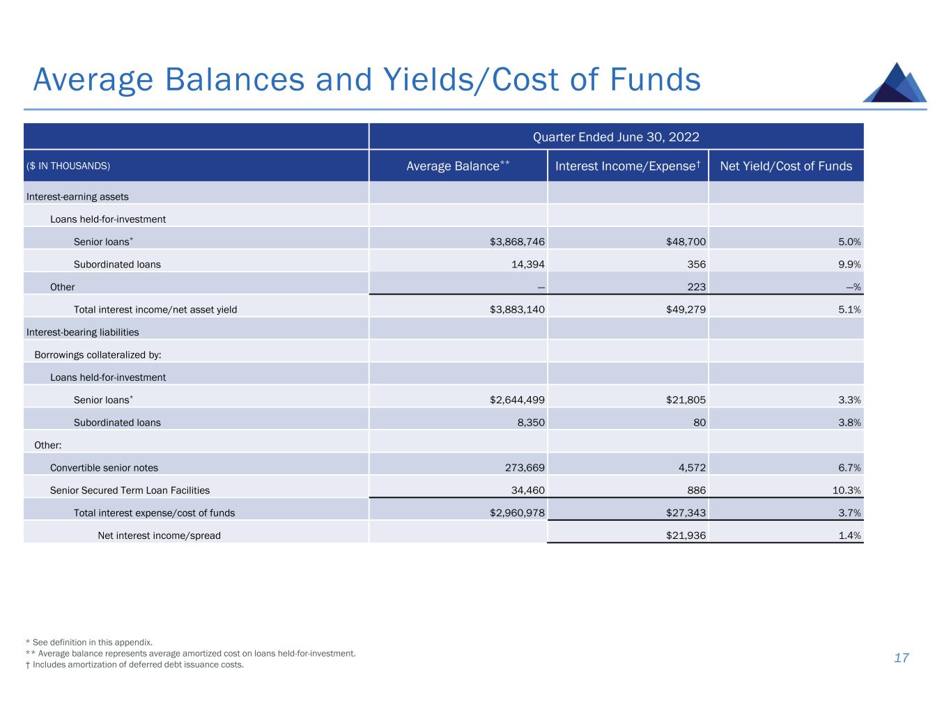 Average Balances and Yields/Cost of Funds 17 Quarter Ended June 30, 2022 ($ IN THOUSANDS) Average Balance** Interest Income/Expense† Net Yield/Cost of Funds Interest-earning assets Loans held-for-investment Senior loans* $3,868,746 $48,700 5.0% Subordinated loans 14,394 356 9.9% Other — 223 —% Total interest income/net asset yield $3,883,140 $49,279 5.1% Interest-bearing liabilities Borrowings collateralized by: Loans held-for-investment Senior loans* $2,644,499 $21,805 3.3% Subordinated loans 8,350 80 3.8% Other: Convertible senior notes 273,669 4,572 6.7% Senior Secured Term Loan Facilities 34,460 886 10.3% Total interest expense/cost of funds $2,960,978 $27,343 3.7% Net interest income/spread $21,936 1.4% * See definition in this appendix. ** Average balance represents average amortized cost on loans held-for-investment. † Includes amortization of deferred debt issuance costs.