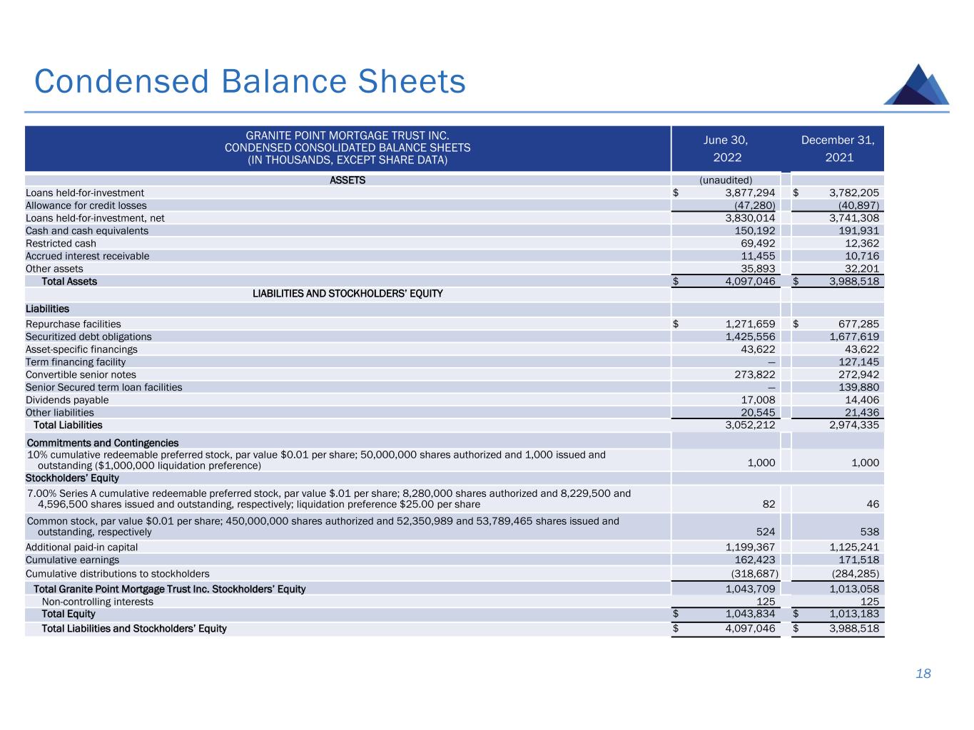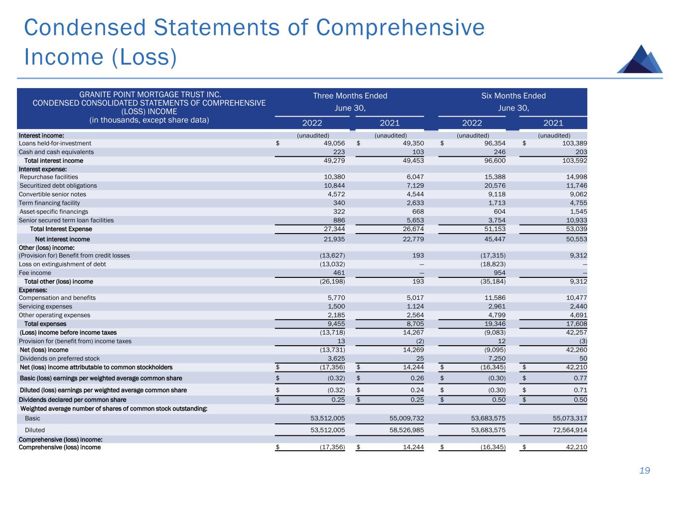 Condensed Balance Sheets 18 GRANITE POINT MORTGAGE TRUST INC. CONDENSED CONSOLIDATED BALANCE SHEETS (IN THOUSANDS, EXCEPT SHARE DATA) June 30, 2022 December 31, 2021 ASSETS (unaudited) Loans held-for-investment $ 3,877,294 $ 3,782,205 Allowance for credit losses (47,280) (40,897) Loans held-for-investment, net 3,830,014 3,741,308 Cash and cash equivalents 150,192 191,931 Restricted cash 69,492 12,362 Accrued interest receivable 11,455 10,716 Other assets 35,893 32,201 Total Assets $ 4,097,046 $ 3,988,518 LIABILITIES AND STOCKHOLDERS’ EQUITY Liabilities Repurchase facilities $ 1,271,659 $ 677,285 Securitized debt obligations 1,425,556 1,677,619 Asset-specific financings 43,622 43,622 Term financing facility — 127,145 Convertible senior notes 273,822 272,942 Senior Secured term loan facilities — 139,880 Dividends payable 17,008 14,406 Other liabilities 20,545 21,436 Total Liabilities 3,052,212 2,974,335 Commitments and Contingencies 10% cumulative redeemable preferred stock, par value $0.01 per share; 50,000,000 shares authorized and 1,000 issued and outstanding ($1,000,000 liquidation preference) 1,000 1,000 Stockholders’ Equity 7.00% Series A cumulative redeemable preferred stock, par value $.01 per share; 8,280,000 shares authorized and 8,229,500 and 4,596,500 shares issued and outstanding, respectively; liquidation preference $25.00 per share 82 46 Common stock, par value $0.01 per share; 450,000,000 shares authorized and 52,350,989 and 53,789,465 shares issued and outstanding, respectively 524 538 Additional paid-in capital 1,199,367 1,125,241 Cumulative earnings 162,423 171,518 Cumulative distributions to stockholders (318,687) (284,285) Total Granite Point Mortgage Trust Inc. Stockholders’ Equity 1,043,709 1,013,058 Non-controlling interests 125 125 Total Equity $ 1,043,834 $ 1,013,183 Total Liabilities and Stockholders’ Equity $ 4,097,046 $ 3,988,518