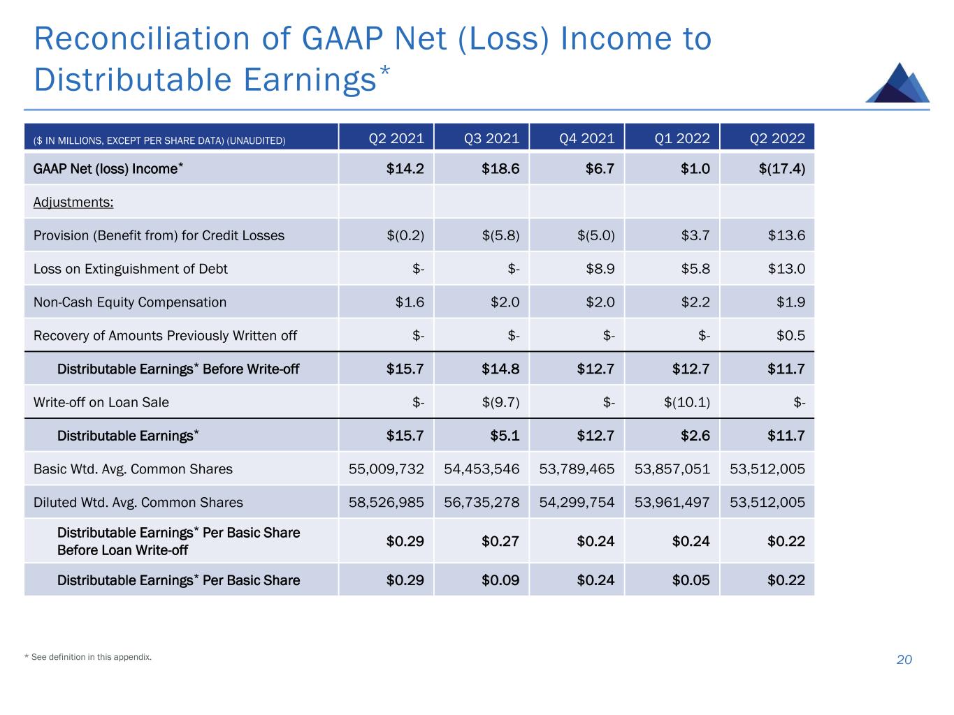 Reconciliation of GAAP Net (Loss) Income to Distributable Earnings* 20 ($ IN MILLIONS, EXCEPT PER SHARE DATA) (UNAUDITED) Q2 2021 Q3 2021 Q4 2021 Q1 2022 Q2 2022 GAAP Net (loss) Income* $14.2 $18.6 $6.7 $1.0 $(17.4) Adjustments: Provision (Benefit from) for Credit Losses $(0.2) $(5.8) $(5.0) $3.7 $13.6 Loss on Extinguishment of Debt $- $- $8.9 $5.8 $13.0 Non-Cash Equity Compensation $1.6 $2.0 $2.0 $2.2 $1.9 Recovery of Amounts Previously Written off $- $- $- $- $0.5 Distributable Earnings* Before Write-off $15.7 $14.8 $12.7 $12.7 $11.7 Write-off on Loan Sale $- $(9.7) $- $(10.1) $- Distributable Earnings* $15.7 $5.1 $12.7 $2.6 $11.7 Basic Wtd. Avg. Common Shares 55,009,732 54,453,546 53,789,465 53,857,051 53,512,005 Diluted Wtd. Avg. Common Shares 58,526,985 56,735,278 54,299,754 53,961,497 53,512,005 Distributable Earnings* Per Basic Share Before Loan Write-off $0.29 $0.27 $0.24 $0.24 $0.22 Distributable Earnings* Per Basic Share $0.29 $0.09 $0.24 $0.05 $0.22 * See definition in this appendix.
