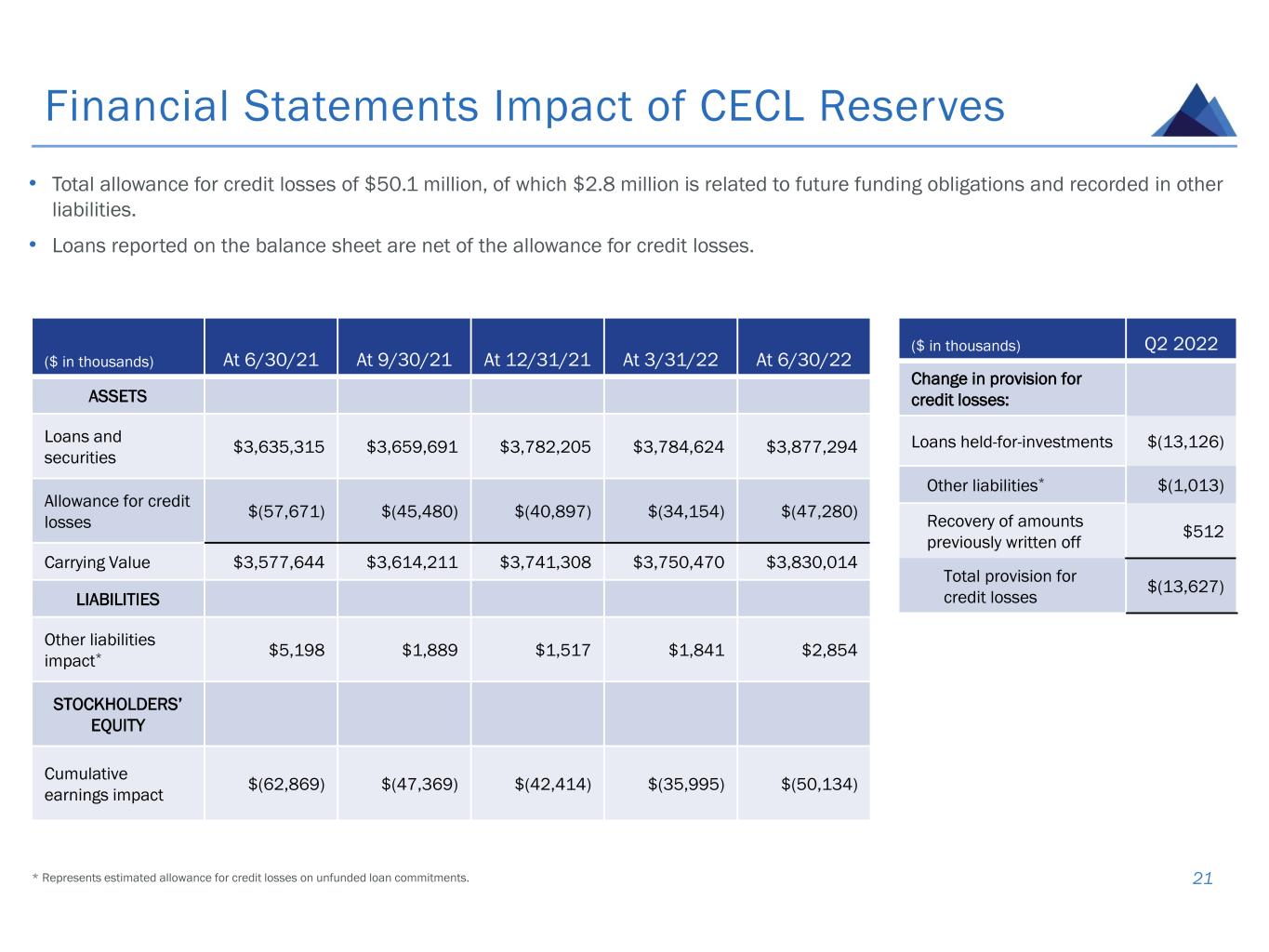 ($ in thousands) At 6/30/21 At 9/30/21 At 12/31/21 At 3/31/22 At 6/30/22 ASSETS Loans and securities $3,635,315 $3,659,691 $3,782,205 $3,784,624 $3,877,294 Allowance for credit losses $(57,671) $(45,480) $(40,897) $(34,154) $(47,280) Carrying Value $3,577,644 $3,614,211 $3,741,308 $3,750,470 $3,830,014 LIABILITIES Other liabilities impact* $5,198 $1,889 $1,517 $1,841 $2,854 STOCKHOLDERS’ EQUITY Cumulative earnings impact $(62,869) $(47,369) $(42,414) $(35,995) $(50,134) Financial Statements Impact of CECL Reserves 21 • Total allowance for credit losses of $50.1 million, of which $2.8 million is related to future funding obligations and recorded in other liabilities. • Loans reported on the balance sheet are net of the allowance for credit losses. ($ in thousands) Q2 2022 Change in provision for credit losses: Loans held-for-investments $(13,126) Other liabilities* $(1,013) Recovery of amounts previously written off $512 Total provision for credit losses $(13,627) * Represents estimated allowance for credit losses on unfunded loan commitments.