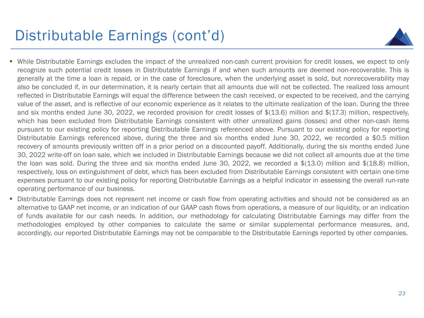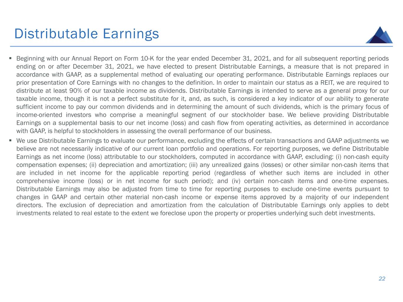 ▪ Beginning with our Annual Report on Form 10-K for the year ended December 31, 2021, and for all subsequent reporting periods ending on or after December 31, 2021, we have elected to present Distributable Earnings, a measure that is not prepared in accordance with GAAP, as a supplemental method of evaluating our operating performance. Distributable Earnings replaces our prior presentation of Core Earnings with no changes to the definition. In order to maintain our status as a REIT, we are required to distribute at least 90% of our taxable income as dividends. Distributable Earnings is intended to serve as a general proxy for our taxable income, though it is not a perfect substitute for it, and, as such, is considered a key indicator of our ability to generate sufficient income to pay our common dividends and in determining the amount of such dividends, which is the primary focus of income-oriented investors who comprise a meaningful segment of our stockholder base. We believe providing Distributable Earnings on a supplemental basis to our net income (loss) and cash flow from operating activities, as determined in accordance with GAAP, is helpful to stockholders in assessing the overall performance of our business. ▪ We use Distributable Earnings to evaluate our performance, excluding the effects of certain transactions and GAAP adjustments we believe are not necessarily indicative of our current loan portfolio and operations. For reporting purposes, we define Distributable Earnings as net income (loss) attributable to our stockholders, computed in accordance with GAAP, excluding: (i) non-cash equity compensation expenses; (ii) depreciation and amortization; (iii) any unrealized gains (losses) or other similar non-cash items that are included in net income for the applicable reporting period (regardless of whether such items are included in other comprehensive income (loss) or in net income for such period); and (iv) certain non-cash items and one-time expenses. Distributable Earnings may also be adjusted from time to time for reporting purposes to exclude one-time events pursuant to changes in GAAP and certain other material non-cash income or expense items approved by a majority of our independent directors. The exclusion of depreciation and amortization from the calculation of Distributable Earnings only applies to debt investments related to real estate to the extent we foreclose upon the property or properties underlying such debt investments. Distributable Earnings 22