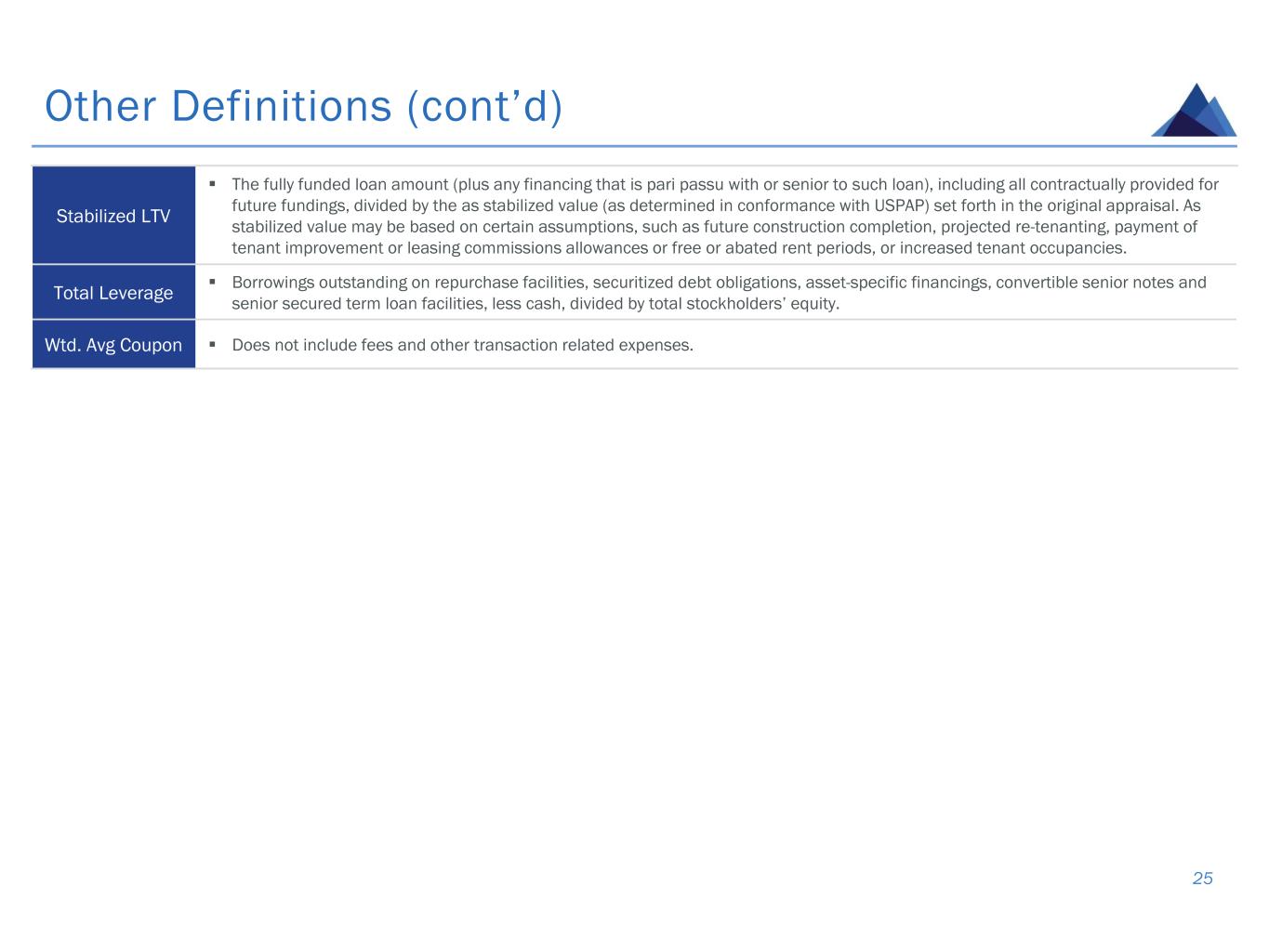 Other Definitions 24 All-in Yield at Origination ▪ Provided for illustrative purposes only. Calculations of all-in yield at origination are based on a number of assumptions (some or all of which may not occur) and are expressed as monthly equivalent yields that include net origination fees and exit fees and exclude future fundings and any potential or completed loan amendments or modifications. Calculations of all-in weighted average yield at origination exclude fixed rate loans. Cash Coupon ▪ Cash coupon does not include origination or exit fees. Future Fundings ▪ Fundings to borrowers of loan principal balances under existing commitments on our loan portfolio. Initial LTV ▪ The initial loan amount (plus any financing that is pari passu with or senior to such loan) divided by the as is appraised value (as determined in conformance with USPAP) as of the date the loan was originated set forth in the original appraisal. Net Income Attributable to Common Stockholders ▪ GAAP net (loss) income attributable to our common stockholders after deducting dividends attributable to our cumulative redeemable preferred stock. Non — MTM ▪ Non-Mark-to-Market. Original Term (Years) ▪ The initial maturity date at origination and does not include any extension options and has not been updated to reflect any subsequent extensions or modifications, if applicable. Pre-Provision, Pre-Loss Earnings ▪ Net interest income, less operating expenses and provision for income taxes. Recourse Leverage ▪ Borrowings outstanding on repurchase facilities, asset-specific financings, convertible senior notes and senior secured term loan facilities, less cash, divided by total stockholders’ equity. Senior Loans ▪ “Senior” means a loan primarily secured by a first priority lien on commercial real property and related personal property and also includes, when applicable, any companion subordinate loans.