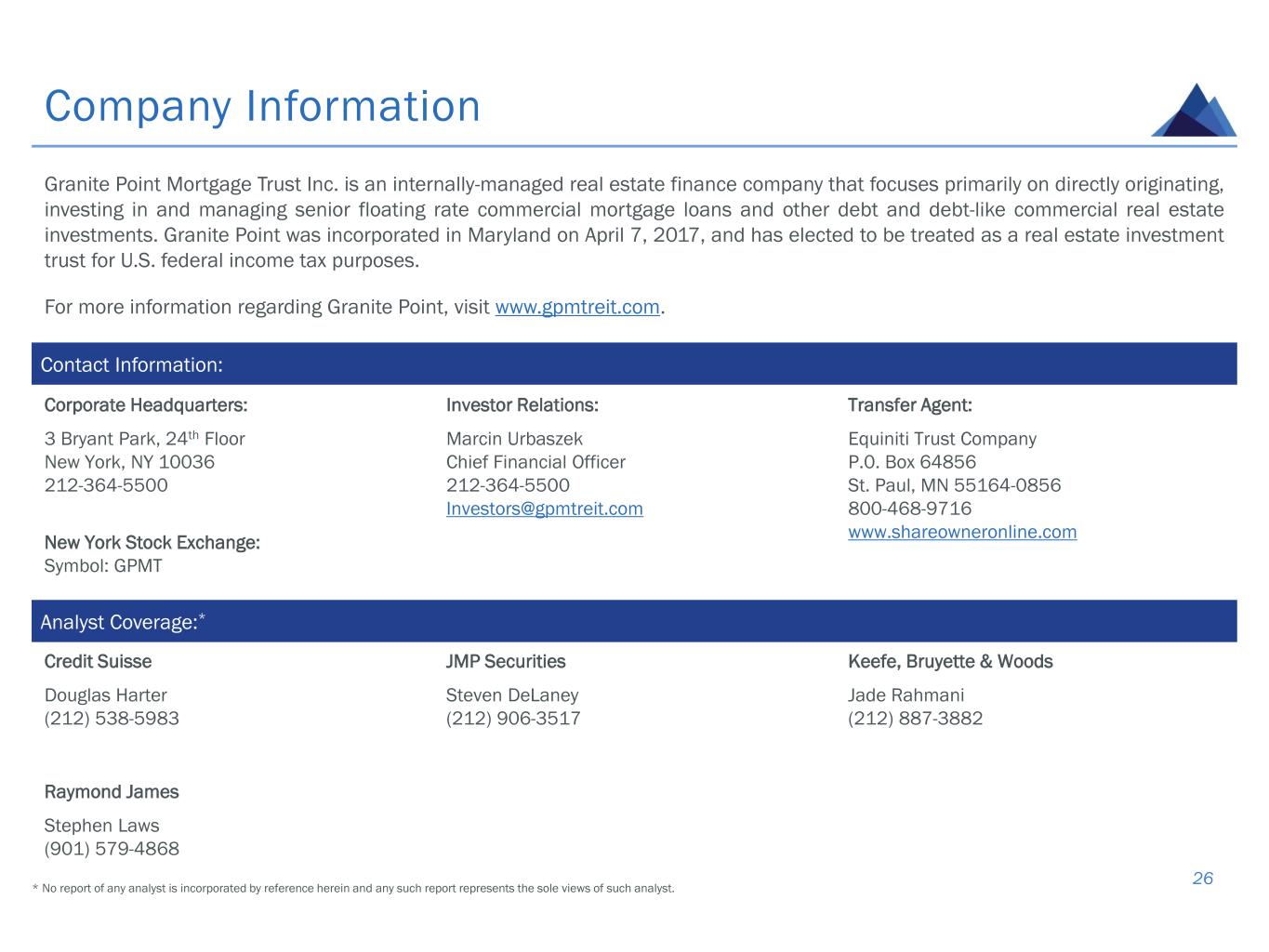 Company Information 26 Granite Point Mortgage Trust Inc. is an internally-managed real estate finance company that focuses primarily on directly originating, investing in and managing senior floating rate commercial mortgage loans and other debt and debt-like commercial real estate investments. Granite Point was incorporated in Maryland on April 7, 2017, and has elected to be treated as a real estate investment trust for U.S. federal income tax purposes. For more information regarding Granite Point, visit www.gpmtreit.com. Contact Information: Corporate Headquarters: 3 Bryant Park, 24th Floor New York, NY 10036 212-364-5500 New York Stock Exchange: Symbol: GPMT Investor Relations: Marcin Urbaszek Chief Financial Officer 212-364-5500 Investors@gpmtreit.com Transfer Agent: Equiniti Trust Company P.0. Box 64856 St. Paul, MN 55164-0856 800-468-9716 www.shareowneronline.com Credit Suisse Douglas Harter (212) 538-5983 JMP Securities Steven DeLaney (212) 906-3517 Keefe, Bruyette & Woods Jade Rahmani (212) 887-3882 Raymond James Stephen Laws (901) 579-4868 Analyst Coverage:* * No report of any analyst is incorporated by reference herein and any such report represents the sole views of such analyst.