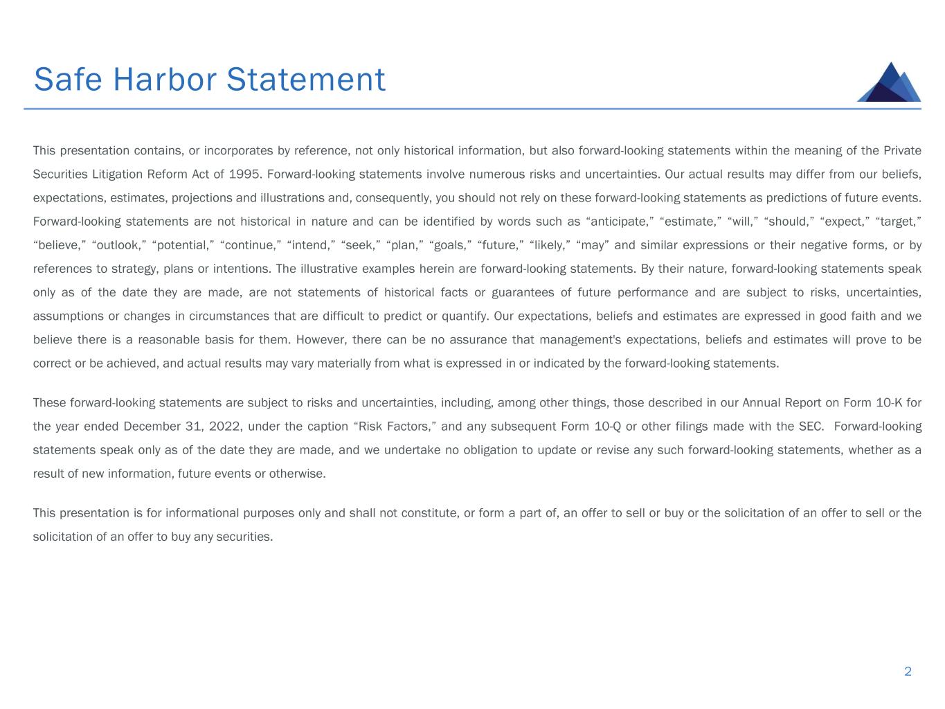 This presentation contains, or incorporates by reference, not only historical information, but also forward-looking statements within the meaning of the Private Securities Litigation Reform Act of 1995. Forward-looking statements involve numerous risks and uncertainties. Our actual results may differ from our beliefs, expectations, estimates, projections and illustrations and, consequently, you should not rely on these forward-looking statements as predictions of future events. Forward-looking statements are not historical in nature and can be identified by words such as “anticipate,” “estimate,” “will,” “should,” “expect,” “target,” “believe,” “outlook,” “potential,” “continue,” “intend,” “seek,” “plan,” “goals,” “future,” “likely,” “may” and similar expressions or their negative forms, or by references to strategy, plans or intentions. The illustrative examples herein are forward-looking statements. By their nature, forward-looking statements speak only as of the date they are made, are not statements of historical facts or guarantees of future performance and are subject to risks, uncertainties, assumptions or changes in circumstances that are difficult to predict or quantify. Our expectations, beliefs and estimates are expressed in good faith and we believe there is a reasonable basis for them. However, there can be no assurance that management's expectations, beliefs and estimates will prove to be correct or be achieved, and actual results may vary materially from what is expressed in or indicated by the forward-looking statements. These forward-looking statements are subject to risks and uncertainties, including, among other things, those described in our Annual Report on Form 10-K for the year ended December 31, 2022, under the caption “Risk Factors,” and any subsequent Form 10-Q or other filings made with the SEC. Forward-looking statements speak only as of the date they are made, and we undertake no obligation to update or revise any such forward-looking statements, whether as a result of new information, future events or otherwise. This presentation is for informational purposes only and shall not constitute, or form a part of, an offer to sell or buy or the solicitation of an offer to sell or the solicitation of an offer to buy any securities. 2 Safe Harbor Statement