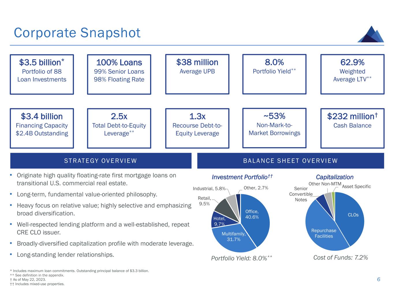 • An internally-managed commercial real estate finance company operating as a REIT, that is focused on originating and investing in floating-rate, first mortgage loans secured by institutional-quality transitional properties. • Investment objective emphasizes preservation of capital while generating attractive risk-adjusted returns over the long-term, primarily through dividends derived from current income produced by the loan portfolio. • $3.5 billion** defensively-positioned nationwide investment portfolio that is diversified across property types, regions and sponsors. • Solution-driven senior investment team with deep industry relationships and decades of real estate lending experience across economic, credit and interest rate cycles. • Conservatively managed balance sheet with a well-balanced funding profile, moderate leverage and $930 million of equity capital. 5 * Except as otherwise indicated in this presentation, reported data is as of, or for the period ended, March 31, 2023. ** Includes maximum loan commitments. Outstanding principal balance of $3.3 billion. Company Overview*