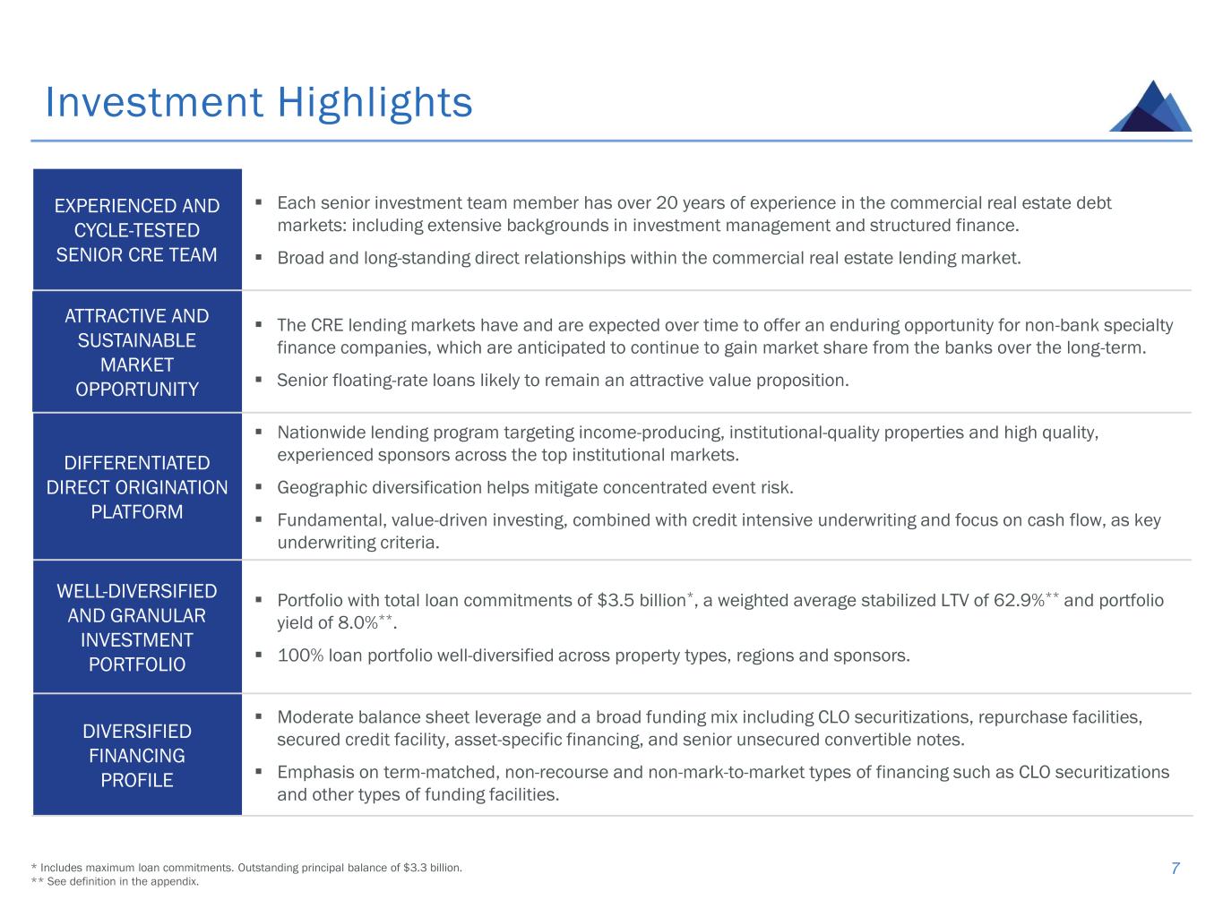 CLOs Repurchase Facilities Senior Convertible Notes Other Non-MTM Asset Specific Office, 40.6% Multifamily, 31.7% Hotel, 9.7% Retail, 9.5% Industrial, 5.8% Other, 2.7% • Originate high quality floating-rate first mortgage loans on transitional U.S. commercial real estate. • Long-term, fundamental value-oriented philosophy. • Heavy focus on relative value; highly selective and emphasizing broad diversification. • Well-respected lending platform and a well-established, repeat CRE CLO issuer. • Broadly-diversified capitalization profile with moderate leverage. • Long-standing lender relationships. BA L A NC E S H E E T OV E RV I E WST R AT E GY OV E RV I E W Portfolio Yield: 8.0%** Cost of Funds: 7.2% Investment Portfolio†† Capitalization * Includes maximum loan commitments. Outstanding principal balance of $3.3 billion. ** See definition in the appendix. † As of May 22, 2023. †† Includes mixed-use properties. 6 $3.5 billion* Portfolio of 88 Loan Investments 100% Loans 99% Senior Loans 98% Floating Rate $38 million Average UPB 1.3x Recourse Debt-to- Equity Leverage 62.9% Weighted Average LTV** ~53% Non-Mark-to- Market Borrowings 2.5x Total Debt-to-Equity Leverage** $3.4 billion Financing Capacity $2.4B Outstanding $232 million† Cash Balance 8.0% Portfolio Yield** Corporate Snapshot