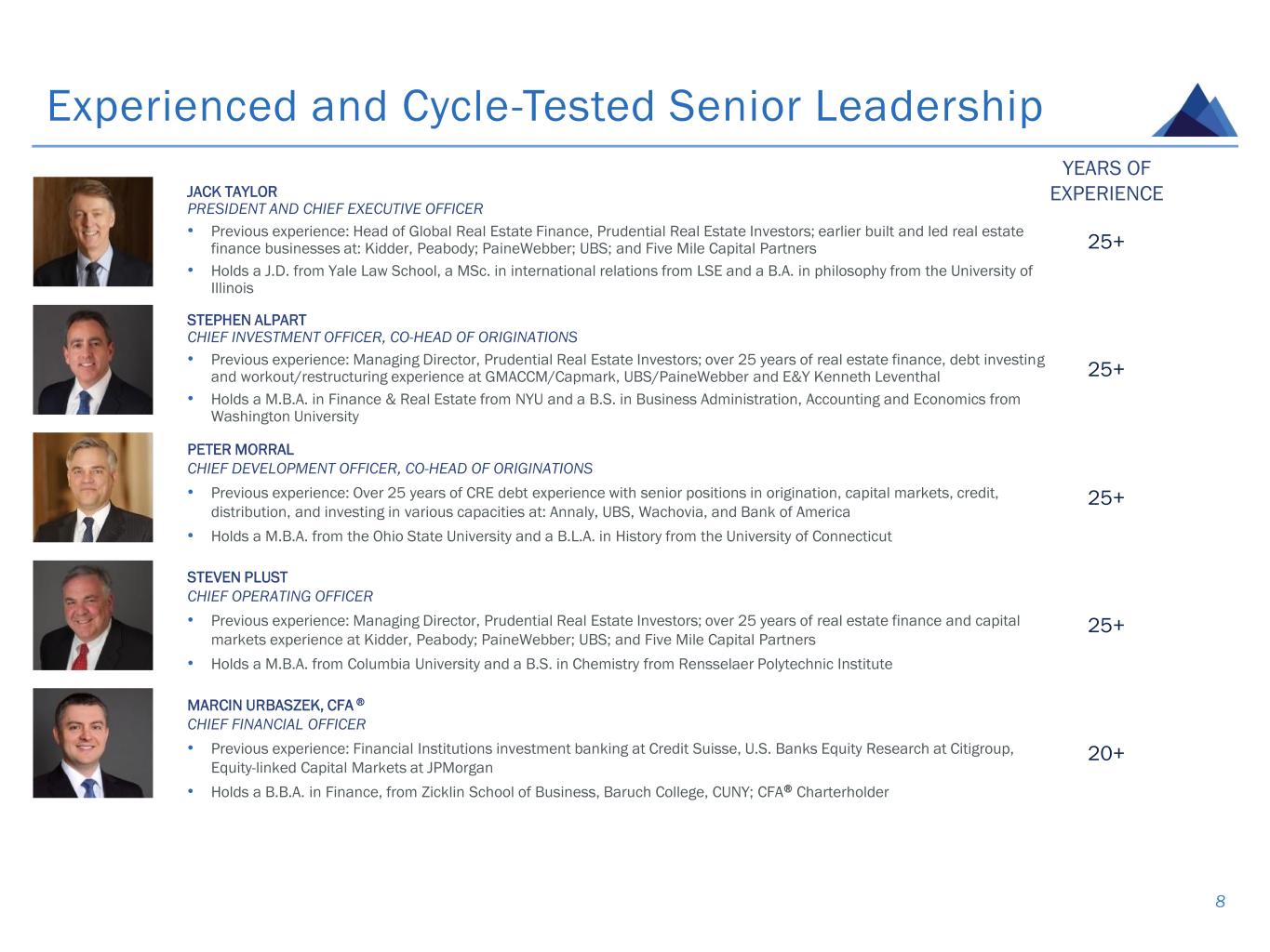 Investment Highlights 7 EXPERIENCED AND CYCLE-TESTED SENIOR CRE TEAM ▪ Each senior investment team member has over 20 years of experience in the commercial real estate debt markets: including extensive backgrounds in investment management and structured finance. ▪ Broad and long-standing direct relationships within the commercial real estate lending market. ATTRACTIVE AND SUSTAINABLE MARKET OPPORTUNITY ▪ The CRE lending markets have and are expected over time to offer an enduring opportunity for non-bank specialty finance companies, which are anticipated to continue to gain market share from the banks over the long-term. ▪ Senior floating-rate loans likely to remain an attractive value proposition. DIFFERENTIATED DIRECT ORIGINATION PLATFORM ▪ Nationwide lending program targeting income-producing, institutional-quality properties and high quality, experienced sponsors across the top institutional markets. ▪ Geographic diversification helps mitigate concentrated event risk. ▪ Fundamental, value-driven investing, combined with credit intensive underwriting and focus on cash flow, as key underwriting criteria. WELL-DIVERSIFIED AND GRANULAR INVESTMENT PORTFOLIO ▪ Portfolio with total loan commitments of $3.5 billion*, a weighted average stabilized LTV of 62.9%** and portfolio yield of 8.0%**. ▪ 100% loan portfolio well-diversified across property types, regions and sponsors. DIVERSIFIED FINANCING PROFILE ▪ Moderate balance sheet leverage and a broad funding mix including CLO securitizations, repurchase facilities, secured credit facility, asset-specific financing, and senior unsecured convertible notes. ▪ Emphasis on term-matched, non-recourse and non-mark-to-market types of financing such as CLO securitizations and other types of funding facilities. * Includes maximum loan commitments. Outstanding principal balance of $3.3 billion. ** See definition in the appendix.