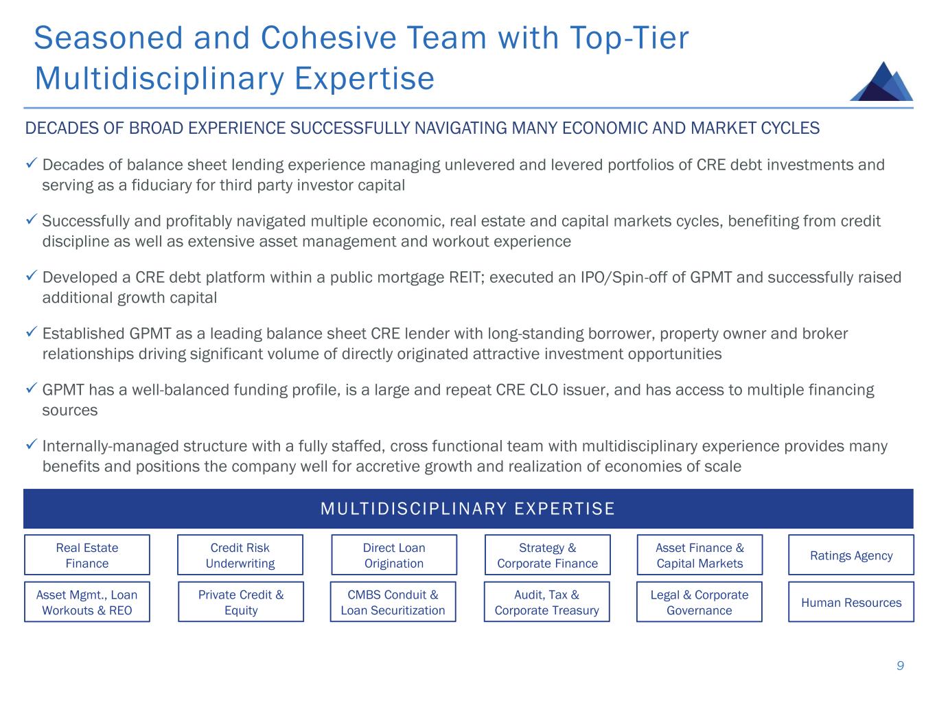 Experienced and Cycle-Tested Senior Leadership 8 JACK TAYLOR PRESIDENT AND CHIEF EXECUTIVE OFFICER • Previous experience: Head of Global Real Estate Finance, Prudential Real Estate Investors; earlier built and led real estate finance businesses at: Kidder, Peabody; PaineWebber; UBS; and Five Mile Capital Partners • Holds a J.D. from Yale Law School, a MSc. in international relations from LSE and a B.A. in philosophy from the University of Illinois 25+ YEARS OF EXPERIENCE STEPHEN ALPART CHIEF INVESTMENT OFFICER, CO-HEAD OF ORIGINATIONS • Previous experience: Managing Director, Prudential Real Estate Investors; over 25 years of real estate finance, debt investing and workout/restructuring experience at GMACCM/Capmark, UBS/PaineWebber and E&Y Kenneth Leventhal • Holds a M.B.A. in Finance & Real Estate from NYU and a B.S. in Business Administration, Accounting and Economics from Washington University 25+ 25+ 25+ 20+ STEVEN PLUST CHIEF OPERATING OFFICER • Previous experience: Managing Director, Prudential Real Estate Investors; over 25 years of real estate finance and capital markets experience at Kidder, Peabody; PaineWebber; UBS; and Five Mile Capital Partners • Holds a M.B.A. from Columbia University and a B.S. in Chemistry from Rensselaer Polytechnic Institute PETER MORRAL CHIEF DEVELOPMENT OFFICER, CO-HEAD OF ORIGINATIONS • Previous experience: Over 25 years of CRE debt experience with senior positions in origination, capital markets, credit, distribution, and investing in various capacities at: Annaly, UBS, Wachovia, and Bank of America • Holds a M.B.A. from the Ohio State University and a B.L.A. in History from the University of Connecticut MARCIN URBASZEK, CFA ® CHIEF FINANCIAL OFFICER • Previous experience: Financial Institutions investment banking at Credit Suisse, U.S. Banks Equity Research at Citigroup, Equity-linked Capital Markets at JPMorgan • Holds a B.B.A. in Finance, from Zicklin School of Business, Baruch College, CUNY; CFA® Charterholder