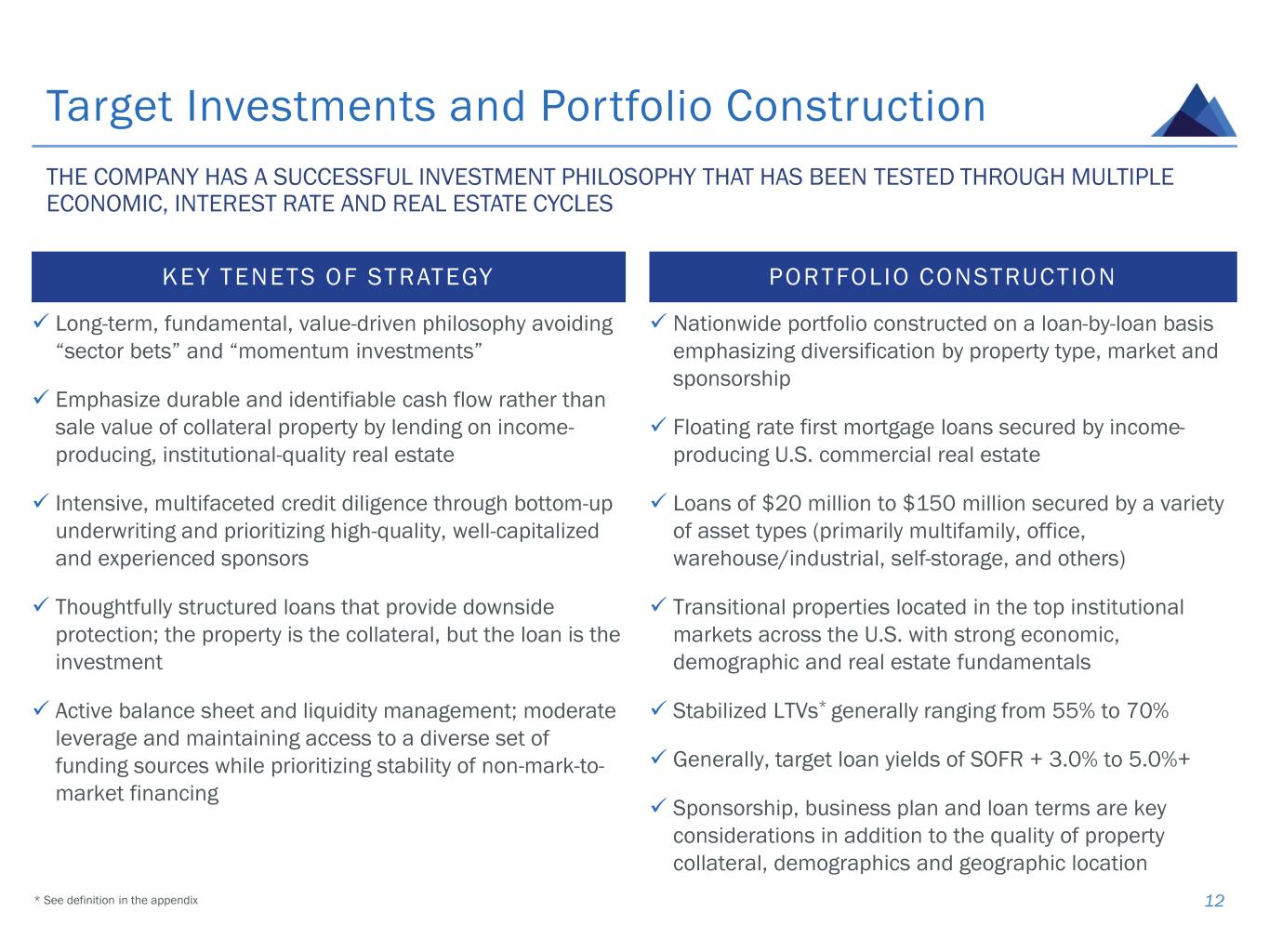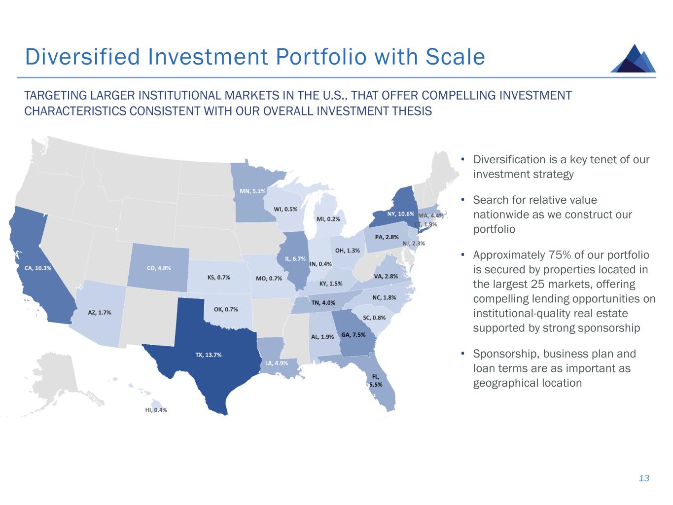 * See definition in the appendix Target Investments and Portfolio Construction 12 KEY TENETS OF STRATEGY PORTFOLIO CONSTRUCTION ✓ Long-term, fundamental, value-driven philosophy avoiding “sector bets” and “momentum investments” ✓ Emphasize durable and identifiable cash flow rather than sale value of collateral property by lending on income- producing, institutional-quality real estate ✓ Intensive, multifaceted credit diligence through bottom-up underwriting and prioritizing high-quality, well-capitalized and experienced sponsors ✓ Thoughtfully structured loans that provide downside protection; the property is the collateral, but the loan is the investment ✓ Active balance sheet and liquidity management; moderate leverage and maintaining access to a diverse set of funding sources while prioritizing stability of non-mark-to- market financing ✓ Nationwide portfolio constructed on a loan-by-loan basis emphasizing diversification by property type, market and sponsorship ✓ Floating rate first mortgage loans secured by income- producing U.S. commercial real estate ✓ Loans of $20 million to $150 million secured by a variety of asset types (primarily multifamily, office, warehouse/industrial, self-storage, and others) ✓ Transitional properties located in the top institutional markets across the U.S. with strong economic, demographic and real estate fundamentals ✓ Stabilized LTVs* generally ranging from 55% to 70% ✓ Generally, target loan yields of SOFR + 3.0% to 5.0%+ ✓ Sponsorship, business plan and loan terms are key considerations in addition to the quality of property collateral, demographics and geographic location THE COMPANY HAS A SUCCESSFUL INVESTMENT PHILOSOPHY THAT HAS BEEN TESTED THROUGH MULTIPLE ECONOMIC, INTEREST RATE AND REAL ESTATE CYCLES