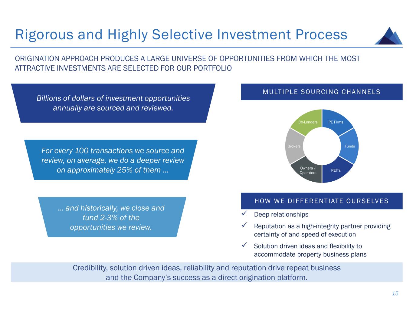 Relationships •Directly sourcing a large volume of investment opportunities through established relationships, high-integrity reputation and extensive market knowledge and experience •Originating loans often involves multiple counterparties, including both operators and mortgage brokers, and established relationships with multiple touch points help drive transaction volume Process •Employ a highly-disciplined sourcing, screening and underwriting process focused on resource efficiency, to identify the best investment opportunities and provide reliable, timely and creative solutions to borrower counterparties •The origination process is combined with the financing and capital markets function, driving an efficient feedback loop during underwriting and structuring Results •Many lending opportunities are time of the essence, creating a need for reliability and reputation for acting in good faith, which offers a means of differentiation and drives repeat business •Since inception in 2015, the team has sourced and evaluated tens of billions of dollars of opportunities, while closing on over $6 billion of loan investments Direct Origination Platform Supported by Strong Reputation and Longstanding Relationships DIFFERENTIATED ORIGINATION STRATEGY TARGETING HIGH-QUALITY LOANS ON INSTITUTIONAL-QUALITY PROPERTIES ACROSS ATTRACTIVE MARKETS WITH WELL-CAPITALIZED AND EXPERIENCED SPONSORS • Borrowers range from large private equity firms and national operators to regional and local owners/operators with extensive market and property-type expertise • Team of 7 seasoned originators with an average of over 15 years of experience and longstanding relationships with various market participants 14