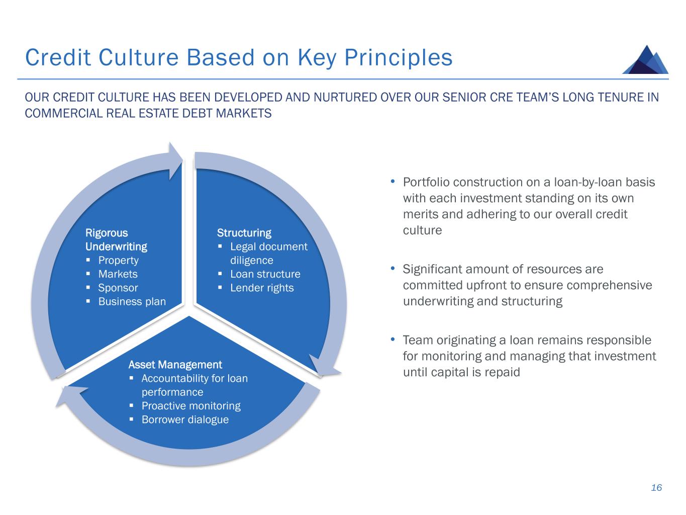 Rigorous and Highly Selective Investment Process 15 Billions of dollars of investment opportunities annually are sourced and reviewed. For every 100 transactions we source and review, on average, we do a deeper review on approximately 25% of them … … and historically, we close and fund 2-3% of the opportunities we review. ✓ Deep relationships ✓ Reputation as a high-integrity partner providing certainty of and speed of execution ✓ Solution driven ideas and flexibility to accommodate property business plans H OW W E D I F F E R E NT I ATE O U R S E LV E S PE Firms Funds REITs Owners / Operators Brokers Co-Lenders M U LT I PL E S O U RC I N G C H A N NE L S Credibility, solution driven ideas, reliability and reputation drive repeat business and the Company’s success as a direct origination platform. ORIGINATION APPROACH PRODUCES A LARGE UNIVERSE OF OPPORTUNITIES FROM WHICH THE MOST ATTRACTIVE INVESTMENTS ARE SELECTED FOR OUR PORTFOLIO