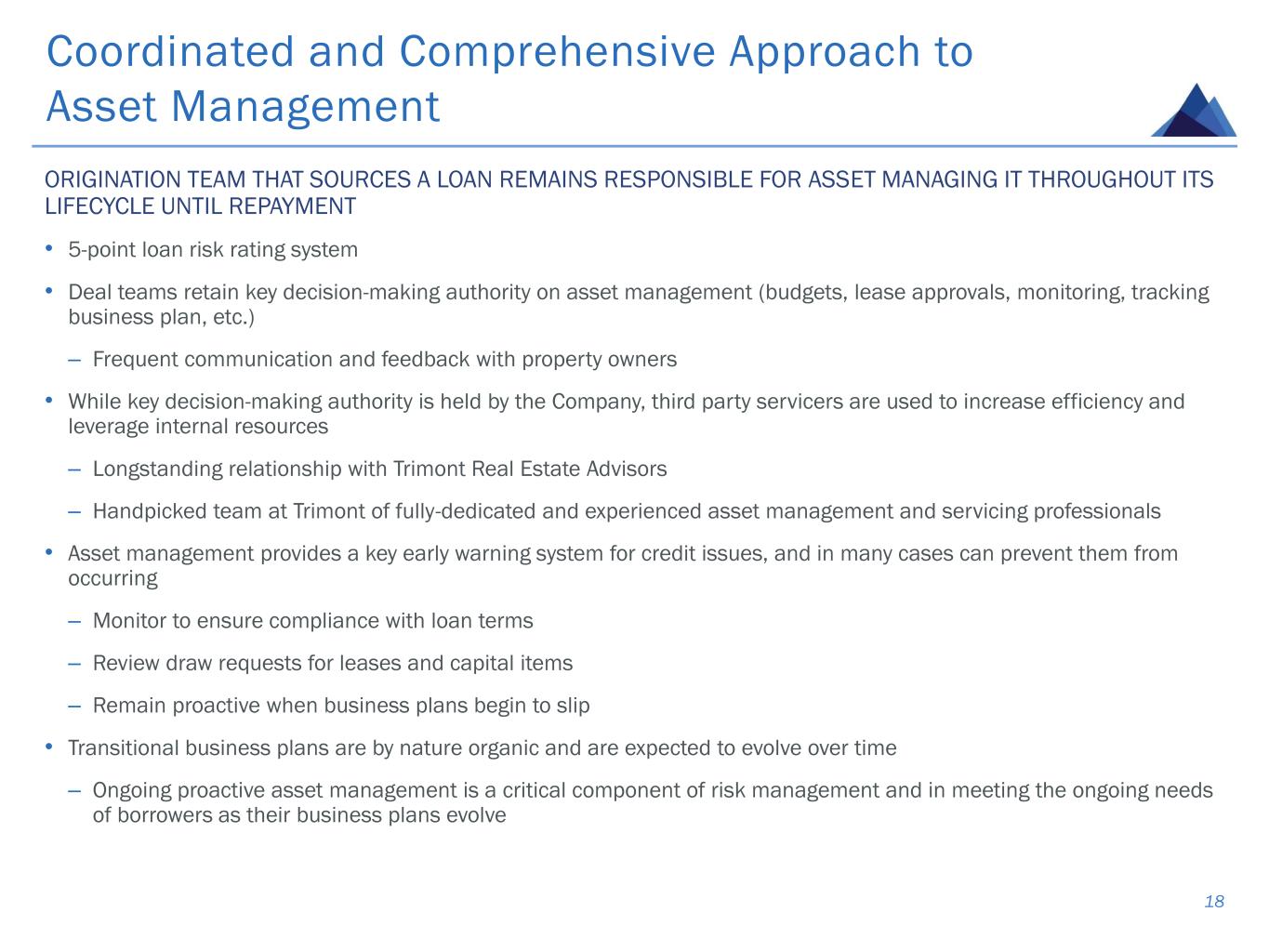 Life Cycle of a Loan Investment ORIGINATIONS AND OPERATIONS PROCESS INVOLVES CONTINUOUS COMMUNICATIONS ACROSS THE COMPANY FROM DEAL SOURCING THROUGH ASSET MANAGEMENT 17 Sourcing Underwriting Closing Financing Ongoing Asset Management • Broad industry relationships with a variety of market participants • Multiple touch points on a given transaction • Daily meetings to review pipeline or screen potential opportunities • Members of the Investment Committee get involved early • Underwriting is done in-house and focused on collateral and sponsor analysis, business plan review and exit strategy • Engage third party appraisers, engineers and other consultants • Visit each property / local market before closing • Negotiate term sheet detailing key investment terms • Engage select group of experienced law firms to help negotiate loan documents • Closely coordinate internally on financing, treasury, tax, legal, accounting and other areas • Diversified sources of loan-level financing • Multiple financing facilities with large financial institutions • CRE CLOs • Structured financings • Originators are also asset managers • While we contract with third party servicers to administer the loans, the deal teams retain key decision-making authority on major property items (budgets, lease approvals, etc.) Members of the Investment Committee involved throughout