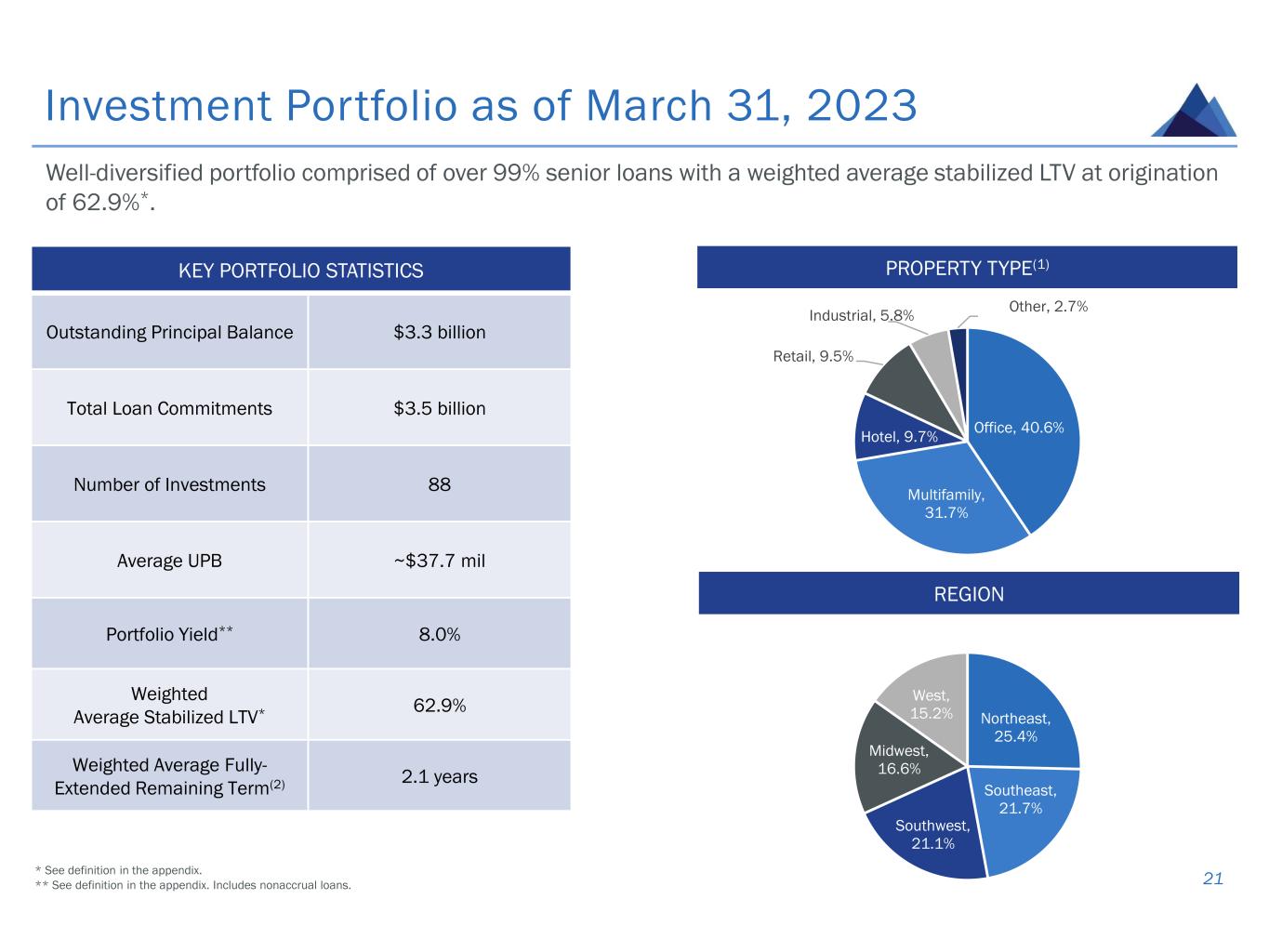 Northeast, 37.6% West, 19.8% Southwest, 18.8% Southeast, 18.7% Midwest, 6.1% Total Portfolio: $1.8 billion Average Loan Balance: ~$42.8 million Senior Loans: 89.6% Office, 50.8% Multifamily, 17.1% Retail, 15.9% Industrial, 9.3% Hotel, 6.9% Investment Portfolio Diversification 20 At IPO March 31, 2023 R e g io n Total Portfolio: $3.5 billion* Average Loan Balance: ~$37.7 million Senior Loans: 99.6% P ro p e rt y Ty p e December 31, 2019 Total Portfolio: $5.0 billion Average Loan Balance: ~$35.1 million Senior Loans: 98.7% Northeast, 28.5% Southwest, 21.7%West, 17.3% Midwest, 16.8% Southeast, 15.7% Office, 42.5% Multifamily, 24.9% Hotel, 15.0% Retail, 9.4% Industrial, 7.3% Other, 0.9% PORTFOLIO DIVERSIFICATION IS A KEY TENET OF OUR INVESTMENT AND RISK MANAGEMENT STRATEGY * Includes maximum loan commitments. Outstanding principal balance of $3.3 billion. Northeast, 25.4% Southeast, 21.7% Southwest, 21.1% Midwest, 16.6% West, 15.2% Office, 40.6% Multifamily, 31.7% Hotel, 9.7% Retail, 9.5% Industrial, 5.8% Other, 2.7%