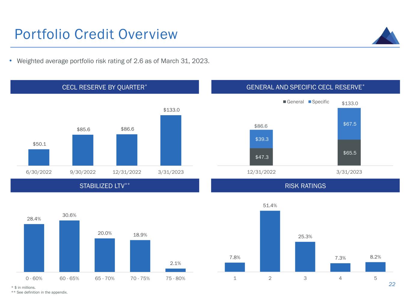 Office, 40.6% Multifamily, 31.7% Hotel, 9.7% Retail, 9.5% Industrial, 5.8% Other, 2.7% Investment Portfolio as of March 31, 2023 21 PROPERTY TYPE(1) REGION * See definition in the appendix. ** See definition in the appendix. Includes nonaccrual loans. KEY PORTFOLIO STATISTICS Outstanding Principal Balance $3.3 billion Total Loan Commitments $3.5 billion Number of Investments 88 Average UPB ~$37.7 mil Portfolio Yield** 8.0% Weighted Average Stabilized LTV* 62.9% Weighted Average Fully- Extended Remaining Term(2) 2.1 years Well-diversified portfolio comprised of over 99% senior loans with a weighted average stabilized LTV at origination of 62.9%*. Northeast, 25.4% Southeast, 21.7% Southwest, 21.1% Midwest, 16.6% West, 15.2%