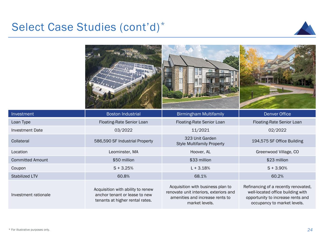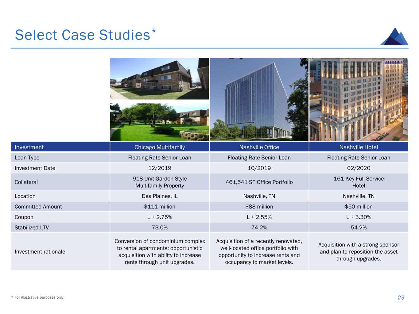 Investment Chicago Multifamily Nashville Office Nashville Hotel Loan Type Floating-Rate Senior Loan Floating-Rate Senior Loan Floating-Rate Senior Loan Investment Date 12/2019 10/2019 02/2020 Collateral 918 Unit Garden Style Multifamily Property 461,541 SF Office Portfolio 161 Key Full-Service Hotel Location Des Plaines, IL Nashville, TN Nashville, TN Committed Amount $111 million $88 million $50 million Coupon L + 2.75% L + 2.55% L + 3.30% Stabilized LTV 73.0% 74.2% 54.2% Investment rationale Conversion of condominium complex to rental apartments; opportunistic acquisition with ability to increase rents through unit upgrades. Acquisition of a recently renovated, well-located office portfolio with opportunity to increase rents and occupancy to market levels. Acquisition with a strong sponsor and plan to reposition the asset through upgrades. Select Case Studies* 23* For illustrative purposes only.