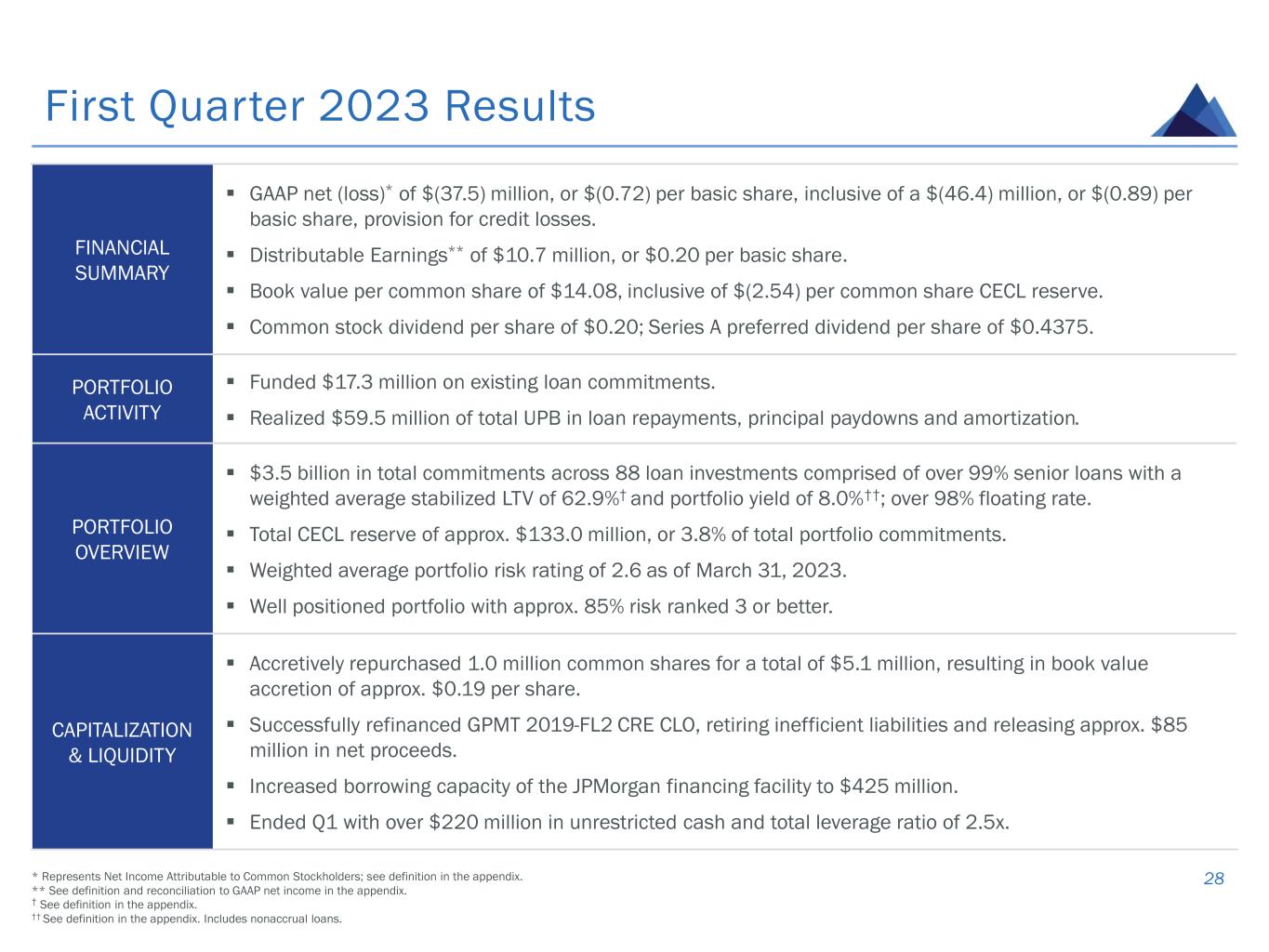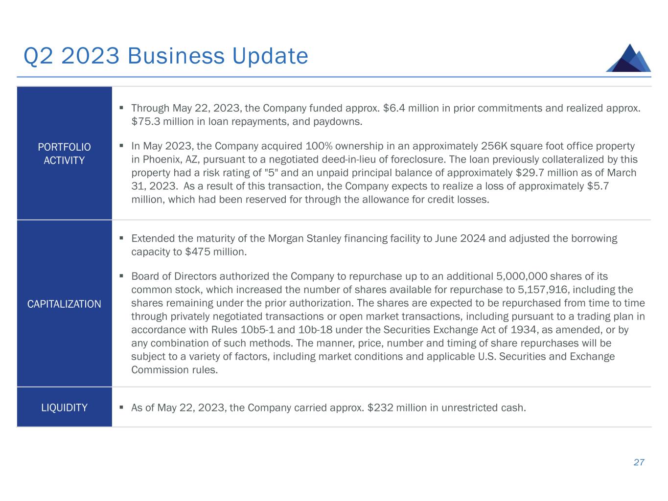 PORTFOLIO ACTIVITY ▪ Through May 22, 2023, the Company funded approx. $6.4 million in prior commitments and realized approx. $75.3 million in loan repayments, and paydowns. ▪ In May 2023, the Company acquired 100% ownership in an approximately 256K square foot office property in Phoenix, AZ, pursuant to a negotiated deed-in-lieu of foreclosure. The loan previously collateralized by this property had a risk rating of "5" and an unpaid principal balance of approximately $29.7 million as of March 31, 2023. As a result of this transaction, the Company expects to realize a loss of approximately $5.7 million, which had been reserved for through the allowance for credit losses. CAPITALIZATION ▪ Extended the maturity of the Morgan Stanley financing facility to June 2024 and adjusted the borrowing capacity to $475 million. ▪ Board of Directors authorized the Company to repurchase up to an additional 5,000,000 shares of its common stock, which increased the number of shares available for repurchase to 5,157,916, including the shares remaining under the prior authorization. The shares are expected to be repurchased from time to time through privately negotiated transactions or open market transactions, including pursuant to a trading plan in accordance with Rules 10b5-1 and 10b-18 under the Securities Exchange Act of 1934, as amended, or by any combination of such methods. The manner, price, number and timing of share repurchases will be subject to a variety of factors, including market conditions and applicable U.S. Securities and Exchange Commission rules. LIQUIDITY ▪ As of May 22, 2023, the Company carried approx. $232 million in unrestricted cash. Q2 2023 Business Update 27