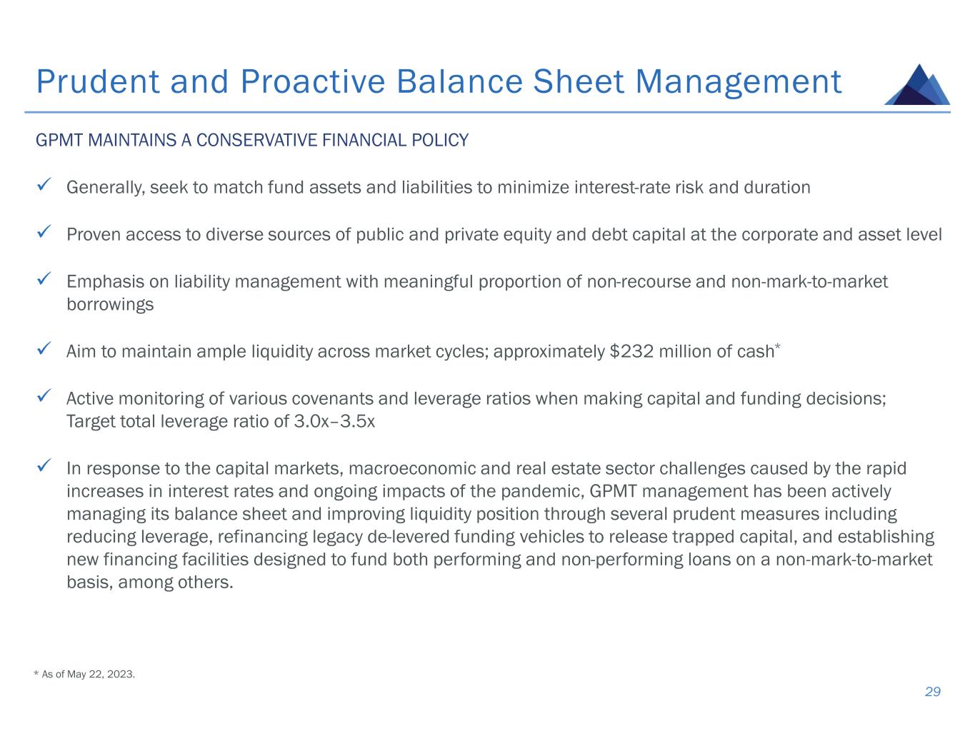 FINANCIAL SUMMARY ▪ GAAP net (loss)* of $(37.5) million, or $(0.72) per basic share, inclusive of a $(46.4) million, or $(0.89) per basic share, provision for credit losses. ▪ Distributable Earnings** of $10.7 million, or $0.20 per basic share. ▪ Book value per common share of $14.08, inclusive of $(2.54) per common share CECL reserve. ▪ Common stock dividend per share of $0.20; Series A preferred dividend per share of $0.4375. PORTFOLIO ACTIVITY ▪ Funded $17.3 million on existing loan commitments. ▪ Realized $59.5 million of total UPB in loan repayments, principal paydowns and amortization. PORTFOLIO OVERVIEW ▪ $3.5 billion in total commitments across 88 loan investments comprised of over 99% senior loans with a weighted average stabilized LTV of 62.9%† and portfolio yield of 8.0%††; over 98% floating rate. ▪ Total CECL reserve of approx. $133.0 million, or 3.8% of total portfolio commitments. ▪ Weighted average portfolio risk rating of 2.6 as of March 31, 2023. ▪ Well positioned portfolio with approx. 85% risk ranked 3 or better. CAPITALIZATION & LIQUIDITY ▪ Accretively repurchased 1.0 million common shares for a total of $5.1 million, resulting in book value accretion of approx. $0.19 per share. ▪ Successfully refinanced GPMT 2019-FL2 CRE CLO, retiring inefficient liabilities and releasing approx. $85 million in net proceeds. ▪ Increased borrowing capacity of the JPMorgan financing facility to $425 million. ▪ Ended Q1 with over $220 million in unrestricted cash and total leverage ratio of 2.5x. First Quarter 2023 Results 28* Represents Net Income Attributable to Common Stockholders; see definition in the appendix. ** See definition and reconciliation to GAAP net income in the appendix. † See definition in the appendix. †† See definition in the appendix. Includes nonaccrual loans.