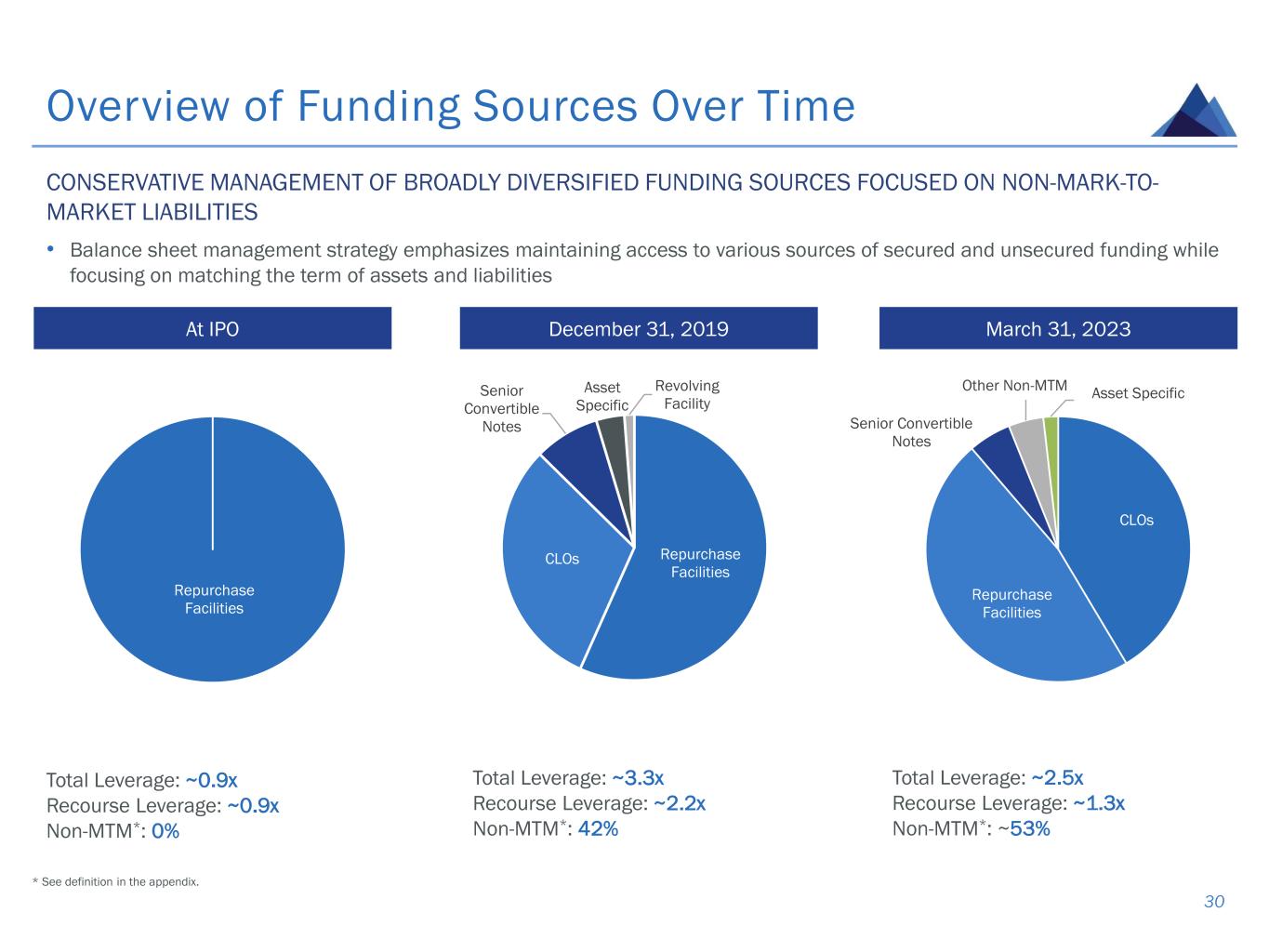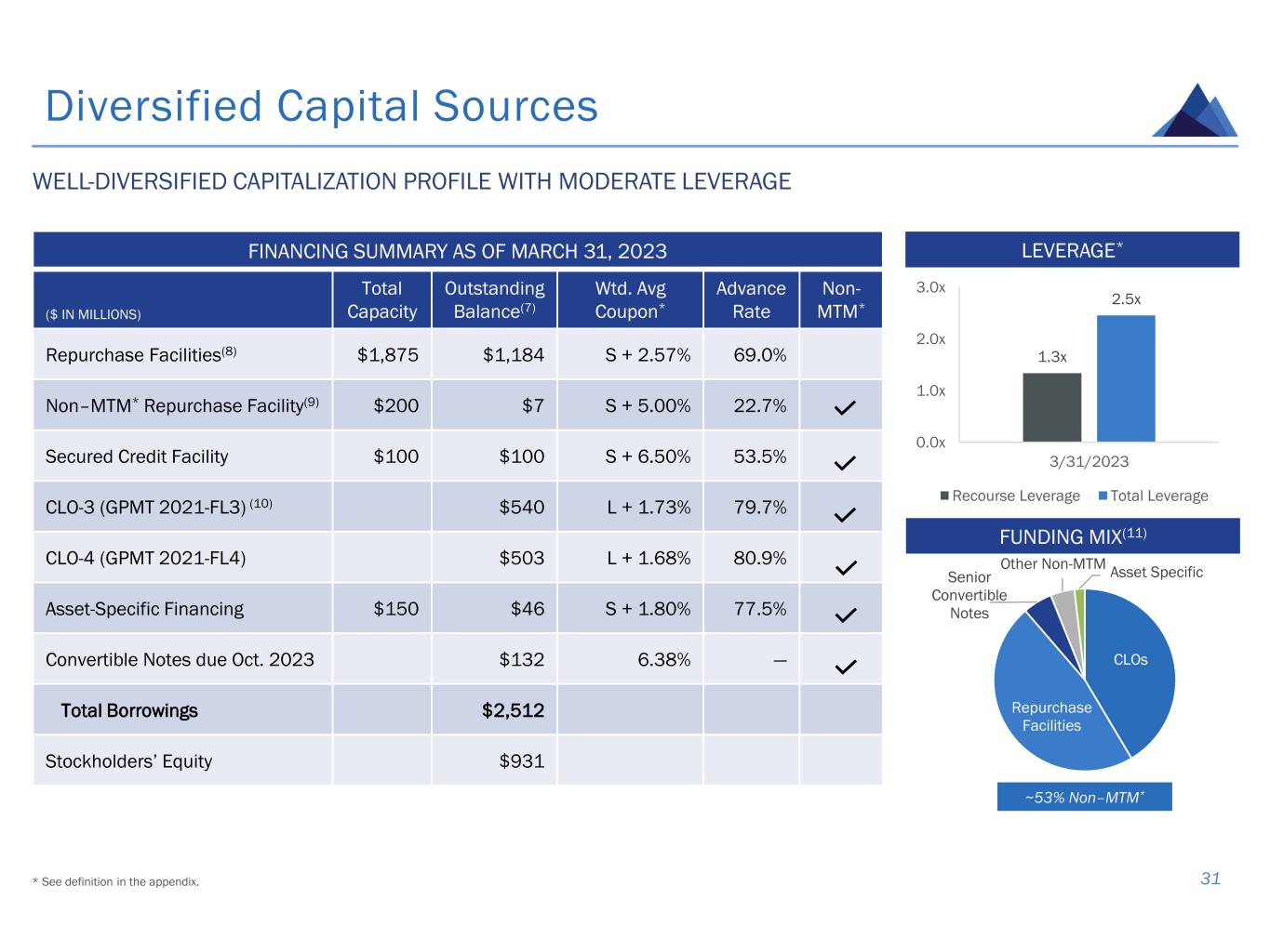 Overview of Funding Sources Over Time 30 CONSERVATIVE MANAGEMENT OF BROADLY DIVERSIFIED FUNDING SOURCES FOCUSED ON NON-MARK-TO- MARKET LIABILITIES • Balance sheet management strategy emphasizes maintaining access to various sources of secured and unsecured funding while focusing on matching the term of assets and liabilities December 31, 2019 March 31, 2023At IPO Total Leverage: ~0.9x Recourse Leverage: ~0.9x Non-MTM*: 0% Total Leverage: ~3.3x Recourse Leverage: ~2.2x Non-MTM*: 42% Total Leverage: ~2.5x Recourse Leverage: ~1.3x Non-MTM*: ~53% Repurchase Facilities Repurchase Facilities CLOs Senior Convertible Notes Asset Specific Revolving Facility * See definition in the appendix. CLOs Repurchase Facilities Senior Convertible Notes Other Non-MTM Asset Specific