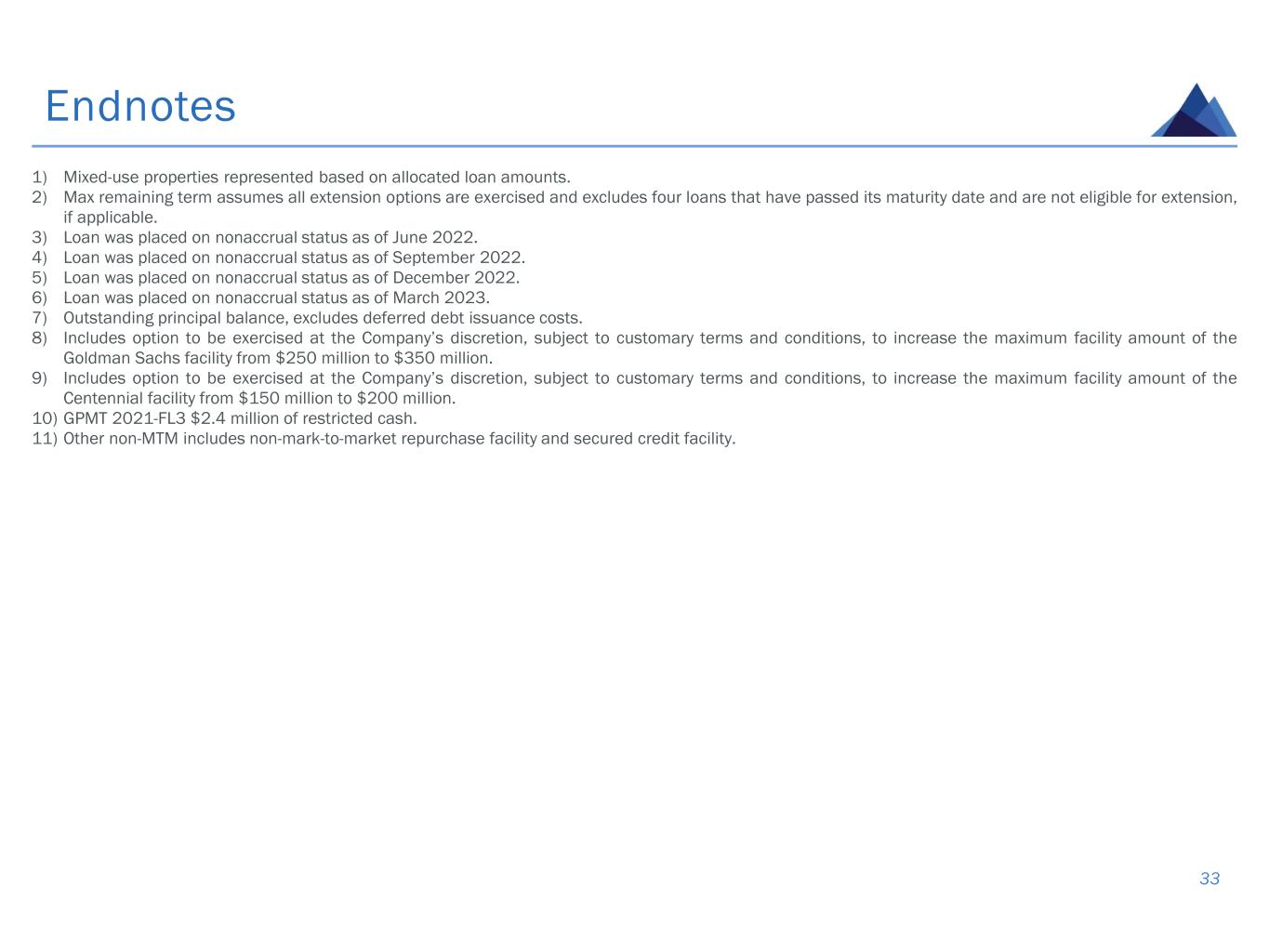 Endnotes 33 1) Mixed-use properties represented based on allocated loan amounts. 2) Max remaining term assumes all extension options are exercised and excludes four loans that have passed its maturity date and are not eligible for extension, if applicable. 3) Loan was placed on nonaccrual status as of June 2022. 4) Loan was placed on nonaccrual status as of September 2022. 5) Loan was placed on nonaccrual status as of December 2022. 6) Loan was placed on nonaccrual status as of March 2023. 7) Outstanding principal balance, excludes deferred debt issuance costs. 8) Includes option to be exercised at the Company’s discretion, subject to customary terms and conditions, to increase the maximum facility amount of the Goldman Sachs facility from $250 million to $350 million. 9) Includes option to be exercised at the Company’s discretion, subject to customary terms and conditions, to increase the maximum facility amount of the Centennial facility from $150 million to $200 million. 10) GPMT 2021-FL3 $2.4 million of restricted cash. 11) Other non-MTM includes non-mark-to-market repurchase facility and secured credit facility.