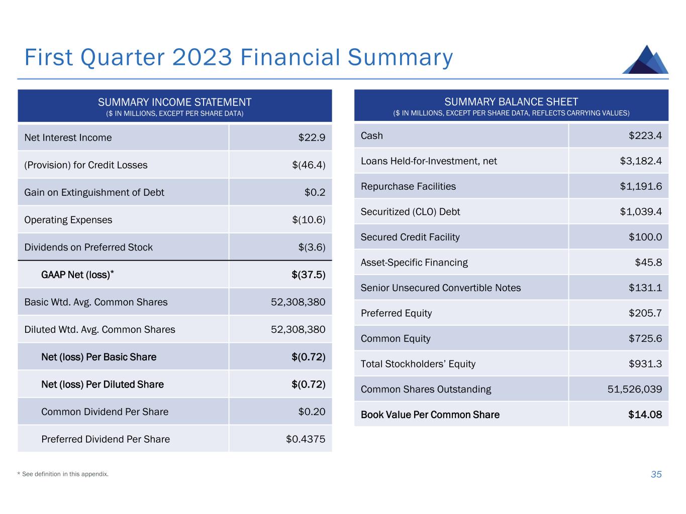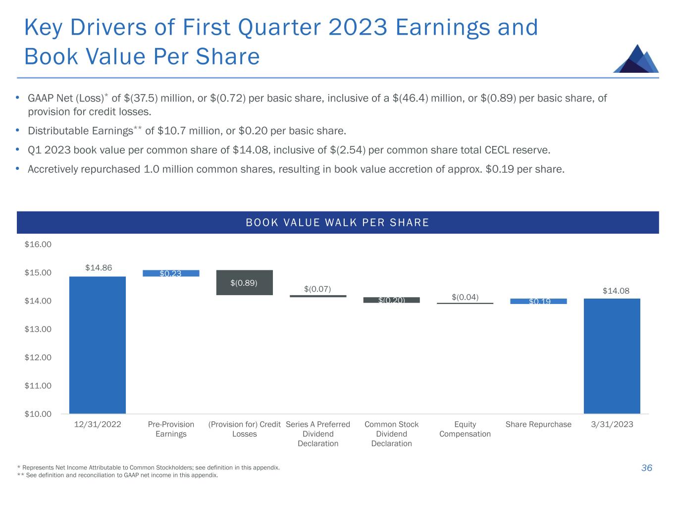 SUMMARY INCOME STATEMENT ($ IN MILLIONS, EXCEPT PER SHARE DATA) Net Interest Income $22.9 (Provision) for Credit Losses $(46.4) Gain on Extinguishment of Debt $0.2 Operating Expenses $(10.6) Dividends on Preferred Stock $(3.6) GAAP Net (loss)* $(37.5) Basic Wtd. Avg. Common Shares 52,308,380 Diluted Wtd. Avg. Common Shares 52,308,380 Net (loss) Per Basic Share $(0.72) Net (loss) Per Diluted Share $(0.72) Common Dividend Per Share $0.20 Preferred Dividend Per Share $0.4375 First Quarter 2023 Financial Summary 35* See definition in this appendix. SUMMARY BALANCE SHEET ($ IN MILLIONS, EXCEPT PER SHARE DATA, REFLECTS CARRYING VALUES) Cash $223.4 Loans Held-for-Investment, net $3,182.4 Repurchase Facilities $1,191.6 Securitized (CLO) Debt $1,039.4 Secured Credit Facility $100.0 Asset-Specific Financing $45.8 Senior Unsecured Convertible Notes $131.1 Preferred Equity $205.7 Common Equity $725.6 Total Stockholders’ Equity $931.3 Common Shares Outstanding 51,526,039 Book Value Per Common Share $14.08