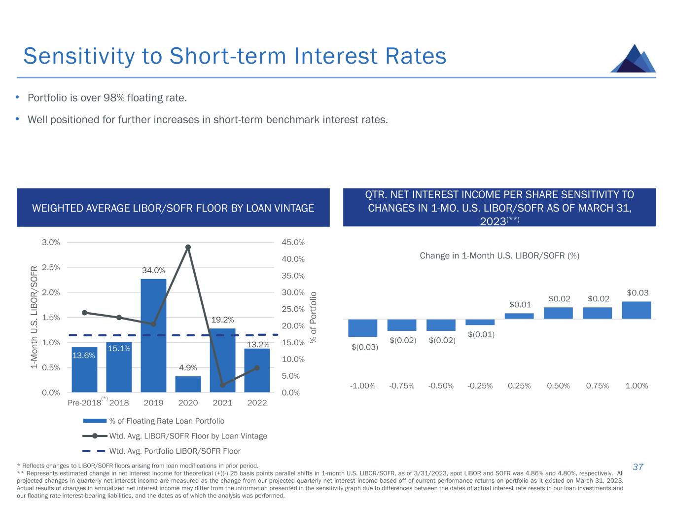 13.6% 15.1% 34.0% 4.9% 19.2% 13.2% 0.0% 5.0% 10.0% 15.0% 20.0% 25.0% 30.0% 35.0% 40.0% 45.0% 0.0% 0.5% 1.0% 1.5% 2.0% 2.5% 3.0% Pre-2018 2018 2019 2020 2021 2022 % o f P o rt fo li o 1 -M o n th U .S . L IB O R / S O F R % of Floating Rate Loan Portfolio Wtd. Avg. LIBOR/SOFR Floor by Loan Vintage Wtd. Avg. Portfolio LIBOR/SOFR Floor 37 Sensitivity to Short-term Interest Rates QTR. NET INTEREST INCOME PER SHARE SENSITIVITY TO CHANGES IN 1-MO. U.S. LIBOR/SOFR AS OF MARCH 31, 2023(**) • Portfolio is over 98% floating rate. • Well positioned for further increases in short-term benchmark interest rates. WEIGHTED AVERAGE LIBOR/SOFR FLOOR BY LOAN VINTAGE (*) $(0.03) $(0.02) $(0.02) $(0.01) $0.01 $0.02 $0.02 $0.03 -1.00% -0.75% -0.50% -0.25% 0.25% 0.50% 0.75% 1.00% Change in 1-Month U.S. LIBOR/SOFR (%) * Reflects changes to LIBOR/SOFR floors arising from loan modifications in prior period. ** Represents estimated change in net interest income for theoretical (+)(-) 25 basis points parallel shifts in 1-month U.S. LIBOR/SOFR, as of 3/31/2023, spot LIBOR and SOFR was 4.86% and 4.80%, respectively. All projected changes in quarterly net interest income are measured as the change from our projected quarterly net interest income based off of current performance returns on portfolio as it existed on March 31, 2023. Actual results of changes in annualized net interest income may differ from the information presented in the sensitivity graph due to differences between the dates of actual interest rate resets in our loan investments and our floating rate interest-bearing liabilities, and the dates as of which the analysis was performed.