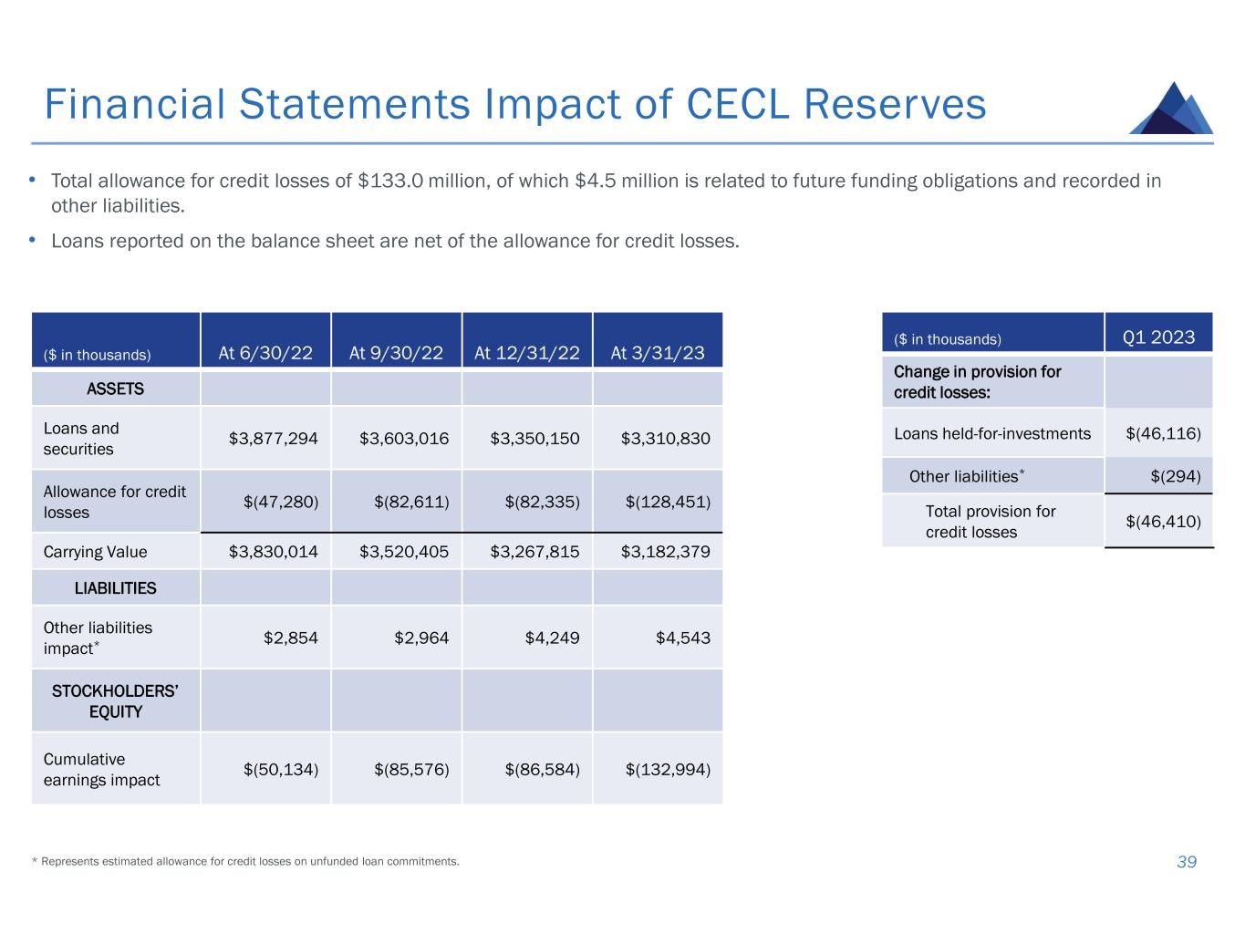 ($ in thousands) At 6/30/22 At 9/30/22 At 12/31/22 At 3/31/23 ASSETS Loans and securities $3,877,294 $3,603,016 $3,350,150 $3,310,830 Allowance for credit losses $(47,280) $(82,611) $(82,335) $(128,451) Carrying Value $3,830,014 $3,520,405 $3,267,815 $3,182,379 LIABILITIES Other liabilities impact* $2,854 $2,964 $4,249 $4,543 STOCKHOLDERS’ EQUITY Cumulative earnings impact $(50,134) $(85,576) $(86,584) $(132,994) Financial Statements Impact of CECL Reserves 39 • Total allowance for credit losses of $133.0 million, of which $4.5 million is related to future funding obligations and recorded in other liabilities. • Loans reported on the balance sheet are net of the allowance for credit losses. ($ in thousands) Q1 2023 Change in provision for credit losses: Loans held-for-investments $(46,116) Other liabilities* $(294) Total provision for credit losses $(46,410) * Represents estimated allowance for credit losses on unfunded loan commitments.