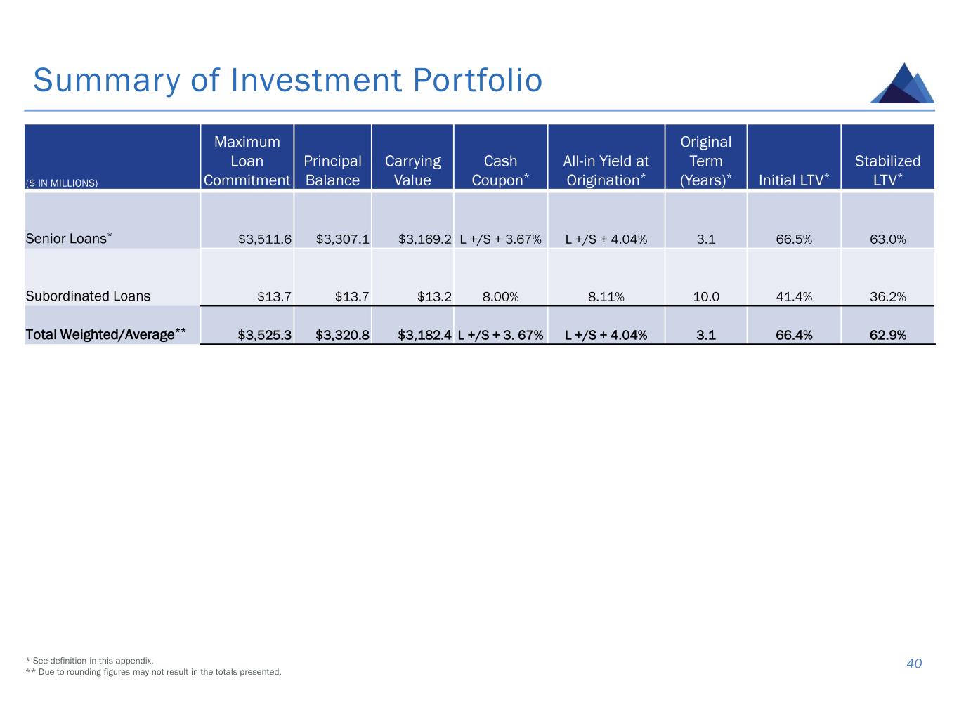 Investment Portfolio Detail 41 ($ IN MILLIONS) Type* Origination Date Maximum Loan Commitment Principal Balance Carrying Value Cash Coupon* All-in Yield at Origination* Original Term (Years)* State Property Type Initial LTV* Stabilized LTV* Asset 1 Senior 12/19 $111.1 $109.2 $109.0 L + 2.75% L + 3.23% 3.0 IL Multifamily 76.5% 73.0% Asset 2 Senior 12/18 96.4 88.7 88.4 L + 3.75% L + 5.21% 3.0 NY Mixed-Use 26.2% 47.6% Asset 3 Senior 08/19 93.1 93.1 93.2 L + 2.80% L + 3.26% 3.0 MN Office 73.1% 71.2% Asset 4 Senior 10/19 92.6 92.6 92.6 L + 3.24% L + 3.86% 3.0 CA Office 63.9% 61.1% Asset 5 Senior 07/19 89.8 79.8 79.7 L + 3.69% L + 4.32% 3.0 IL Office 70.0% 64.4% Asset 6 Senior 10/19 87.8 86.6 86.4 L + 2.55% L + 3.05% 3.0 TN Office 70.2% 74.2% Asset 7 Senior 12/15 82.0 82.0 82.0 L + 4.15% L + 4.43% 4.0 LA Mixed-Use 65.5% 60.0% Asset 8 Senior 01/20 81.9 72.7 72.6 L + 4.25% L + 3.93% 3.0 CO Industrial 47.2% 47.5% Asset 9 Senior 06/19 81.7 81.4 81.4 S + 2.69% S + 3.05% 3.0 TX Mixed-Use 71.7% 72.2% Asset 10 Senior 10/22 77.3 77.3 77.3 S + 4.50% S + 4.61% 2.0 CA Retail 47.7% 36.6% Asset 11 Senior 10/19 76.8 76.8 76.7 L + 3.36% L + 3.73% 3.0 FL Mixed-Use 67.7% 62.9% Asset 12 Senior 12/16 67.8 66.0 66.0 S + 5.15% S + 4.87% 4.0 FL Office 73.3% 63.2% Asset 13 Senior 12/19 63.7 60.5 60.3 S + 3.50% S + 3.28% 3.0 NY Office 68.8% 59.3% Asset 14 Senior 07/21 63.3 63.1 62.8 L + 3.00% L + 3.39% 3.0 LA Multifamily 68.8% 68.6% Asset 15 Senior 12/18 60.1 59.1 59.0 S + 2.90% S + 3.44% 3.0 TX Office 68.5% 66.7% Assets 16-88 Various Various $2,299.9 $2,131.9 $2,123.5 L +/S + 3.80% L +/S + 4.16% 3.2 Various Various 67.8% 63.3% Allowance for Credit Losses $(128.5) Total/Weighted Average** $3,525.3 $3,320.8 $3,182.4 L +/S + 3.67% L +/S + 4.04% 3.1 66.4% 62.9% * See definition in this appendix. ** Due to rounding figures may not result in the totals presented.