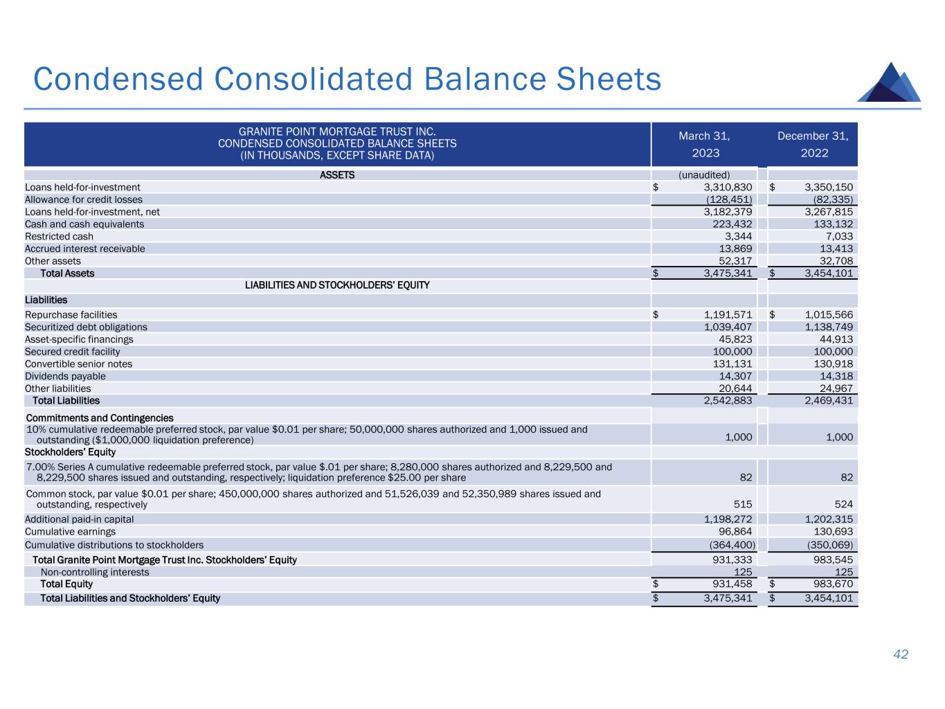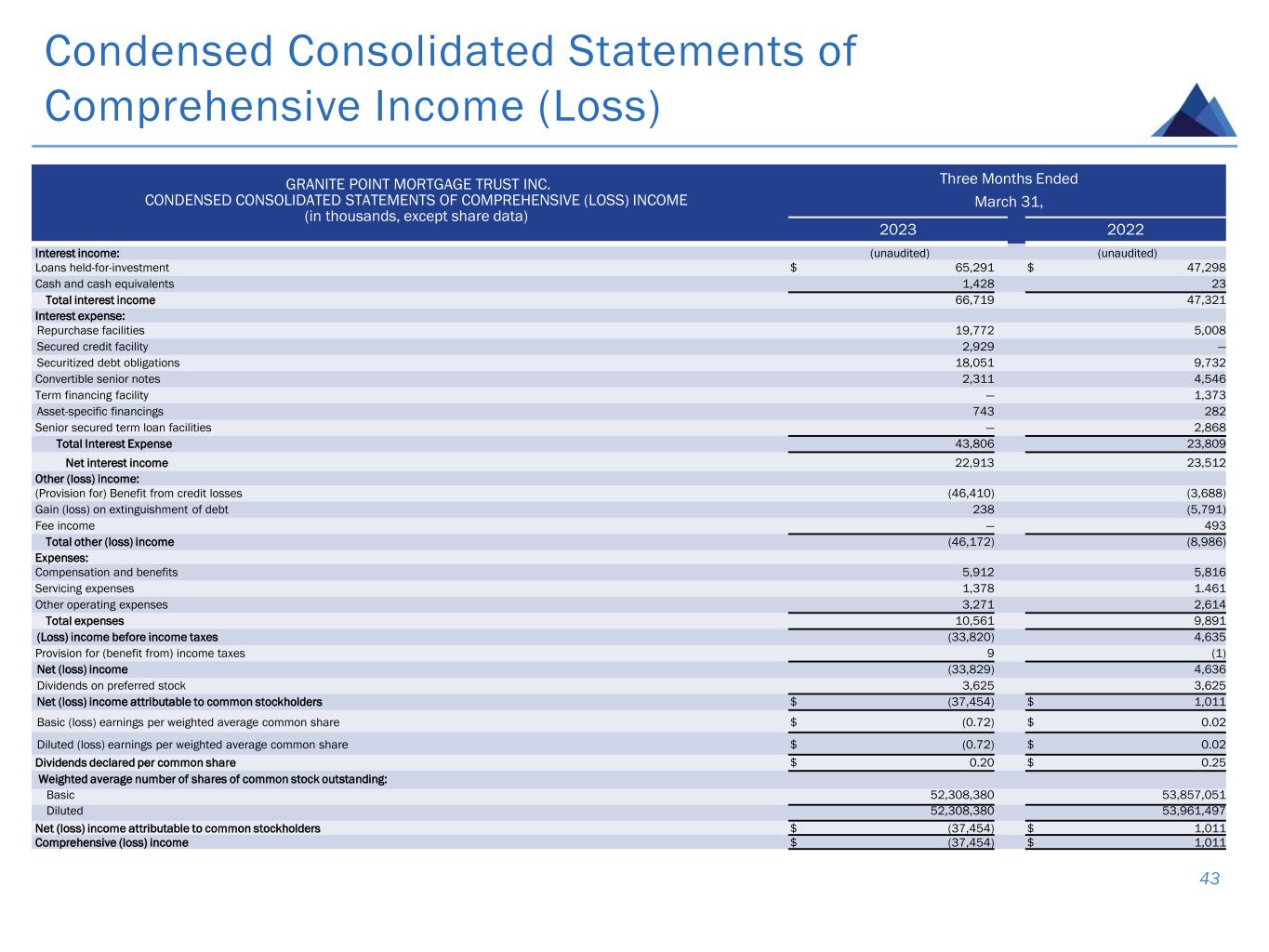 Condensed Consolidated Balance Sheets 42 GRANITE POINT MORTGAGE TRUST INC. CONDENSED CONSOLIDATED BALANCE SHEETS (IN THOUSANDS, EXCEPT SHARE DATA) March 31, 2023 December 31, 2022 ASSETS (unaudited) Loans held-for-investment $ 3,310,830 $ 3,350,150 Allowance for credit losses (128,451) (82,335) Loans held-for-investment, net 3,182,379 3,267,815 Cash and cash equivalents 223,432 133,132 Restricted cash 3,344 7,033 Accrued interest receivable 13,869 13,413 Other assets 52,317 32,708 Total Assets $ 3,475,341 $ 3,454,101 LIABILITIES AND STOCKHOLDERS’ EQUITY Liabilities Repurchase facilities $ 1,191,571 $ 1,015,566 Securitized debt obligations 1,039,407 1,138,749 Asset-specific financings 45,823 44,913 Secured credit facility 100,000 100,000 Convertible senior notes 131,131 130,918 Dividends payable 14,307 14,318 Other liabilities 20,644 24,967 Total Liabilities 2,542,883 2,469,431 Commitments and Contingencies 10% cumulative redeemable preferred stock, par value $0.01 per share; 50,000,000 shares authorized and 1,000 issued and outstanding ($1,000,000 liquidation preference) 1,000 1,000 Stockholders’ Equity 7.00% Series A cumulative redeemable preferred stock, par value $.01 per share; 8,280,000 shares authorized and 8,229,500 and 8,229,500 shares issued and outstanding, respectively; liquidation preference $25.00 per share 82 82 Common stock, par value $0.01 per share; 450,000,000 shares authorized and 51,526,039 and 52,350,989 shares issued and outstanding, respectively 515 524 Additional paid-in capital 1,198,272 1,202,315 Cumulative earnings 96,864 130,693 Cumulative distributions to stockholders (364,400) (350,069) Total Granite Point Mortgage Trust Inc. Stockholders’ Equity 931,333 983,545 Non-controlling interests 125 125 Total Equity $ 931,458 $ 983,670 Total Liabilities and Stockholders’ Equity $ 3,475,341 $ 3,454,101